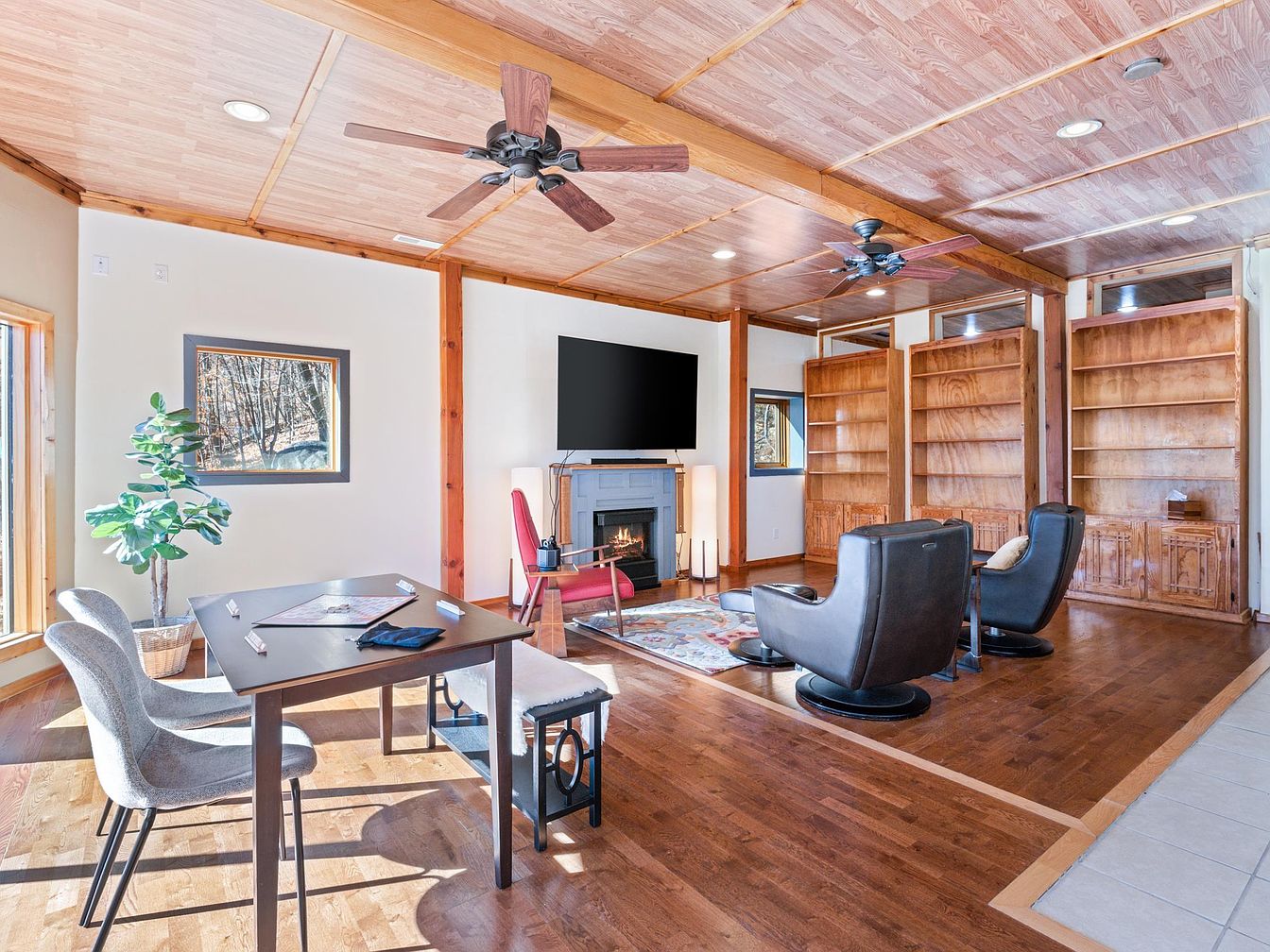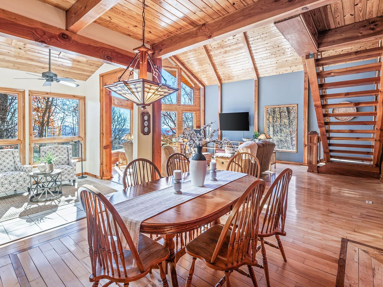 Warm wood tones and expansive windows define this inviting open concept dining area, seamlessly connected to a cozy living space and sunroom. Natural light floods the room, highlighting vaulted wood ceilings, exposed beams, and beautifully finished hardwood floors. The rustic dining table with spindle-back chairs is perfectly suited for family gatherings, and the adjacent seating nook provides a sunny spot for reading or conversation. Subtle blue accent walls contrast with the wood, while the modern pendant light fixture adds a touch of elegance. Easy access to the living room and unobstructed views make this space ideal for family living and entertaining.