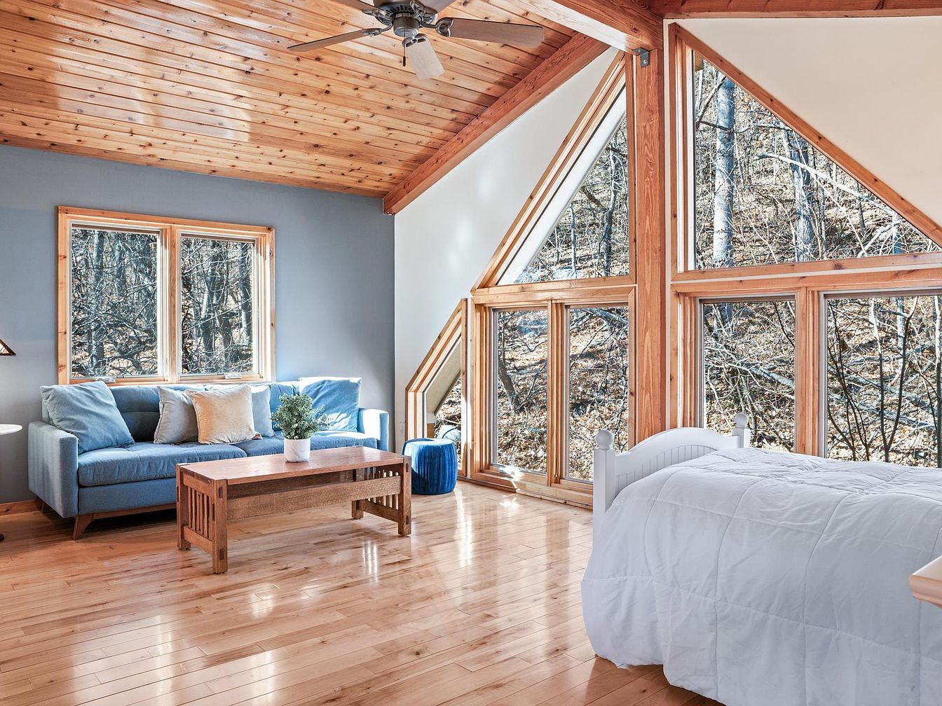 A spacious bedroom showcases vaulted wooden ceilings and expansive windows that invite natural light and scenic woodland views. The airy open-plan design features a cozy seating nook with a blue sofa, accented by plush pillows in complementary hues, ideal for relaxing or family reading time. Honey-toned hardwood floors and matching wood trim add warmth, while an inviting white bed creates a peaceful sleep space. The layout encourages easy movement, perfect for families with children. Accents like the wooden coffee table and indoor plant give the room a homely, comfortable touch, blending rustic charm with modern comfort and family-friendly appeal.