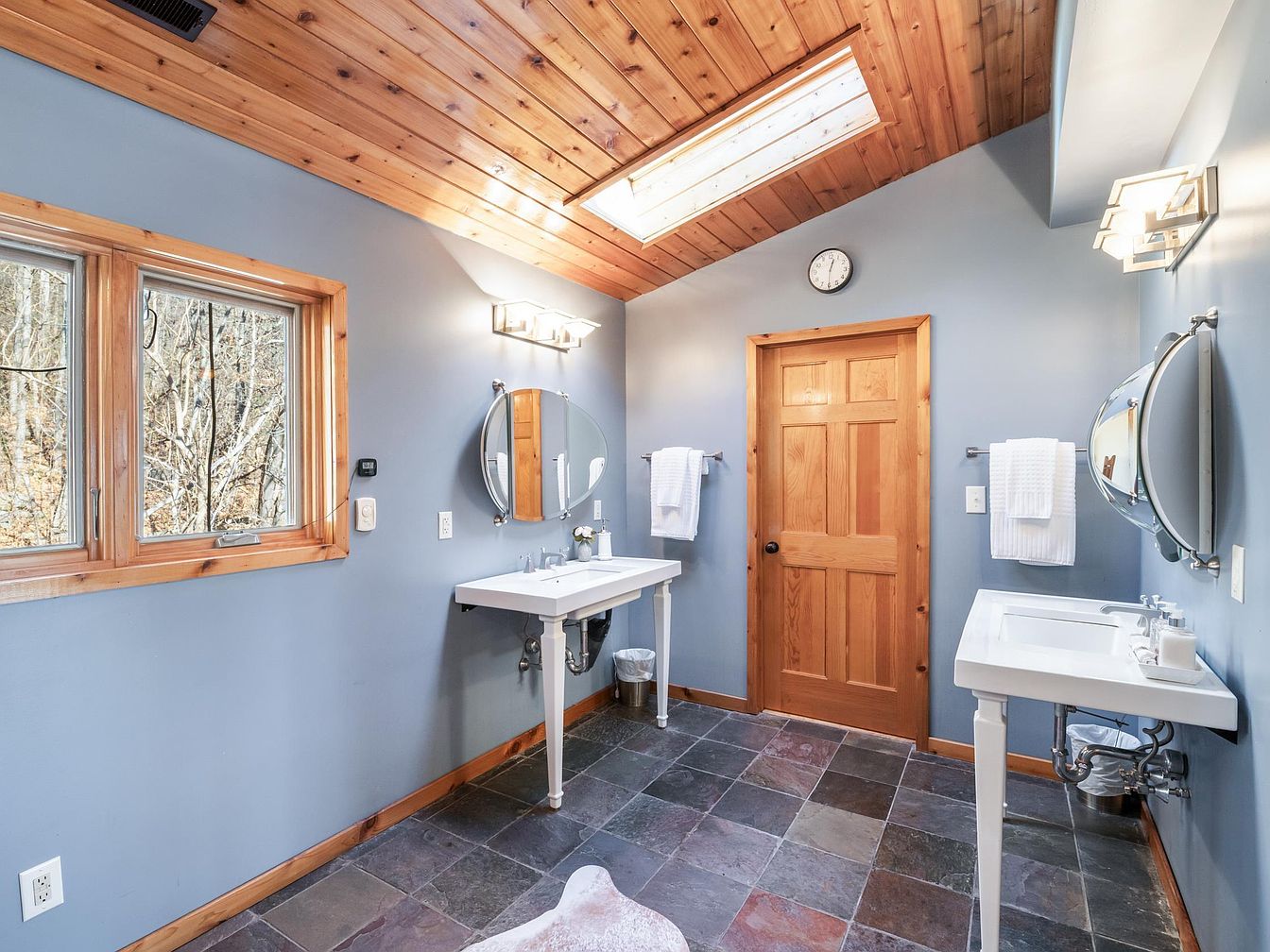A spacious bathroom featuring a double vanity layout with two separate sinks on opposite walls, ideal for families and busy mornings. Soft blue-gray walls contrast beautifully with natural wood trim around the windows, door, and the stunning wood-paneled ceiling. The slate tile floor introduces earthy tones and texture, adding elegance and durability. Modern wall sconces and a large skylight flood the room with light, creating a welcoming atmosphere. The layout prioritizes accessibility and ease of use for multiple family members, with ample space between fixtures, convenient towel racks, and large mirrors for each sink. Cozy, functional, and inviting.