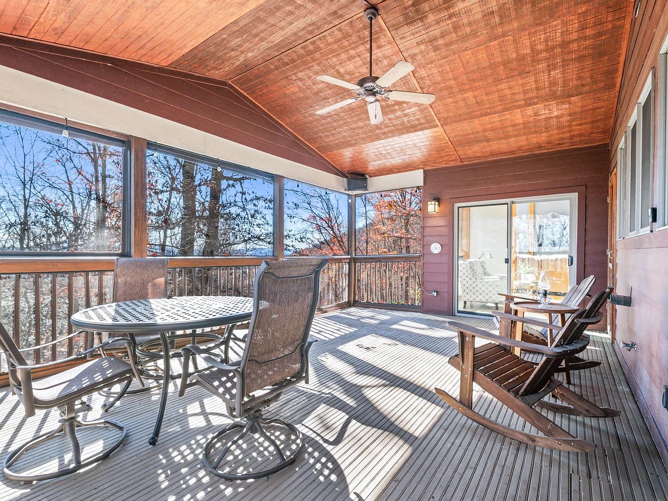 Spacious screened porch blends rustic charm with modern comfort, featuring wooden walls and a cathedral ceiling with a central fan for year-round enjoyment. Large windows offer panoramic forest views while allowing natural light to fill the area. Family-friendly elements include a sturdy oval dining table with four comfortable chairs, perfect for shared meals or game nights, and a pair of classic wooden rocking chairs ideal for quiet relaxation or conversation. Neutral earthy tones create a warm, welcoming atmosphere, while durable deck flooring and smooth transitions to the indoor living spaces via wide sliding doors enhance accessibility and safety for all ages.