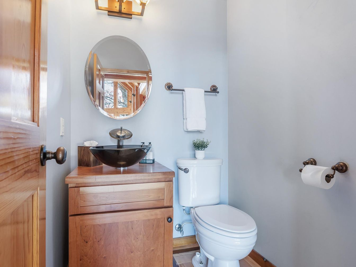 A cozy powder room featuring a harmonious blend of soft grey walls and warm wood accents, highlighted by a natural wood vanity with a sleek, modern glass vessel sink and a stylish waterfall faucet. The round mirror above the vanity reflects abundant natural light from nearby windows, creating an inviting and open atmosphere. Tasteful bronze fixtures lend a touch of classic elegance, while details such as a small potted plant and crisp white towels add freshness and family-friendly appeal. This compact yet thoughtfully designed space ensures comfort and functionality, making it ideal for both daily use and welcoming guests.