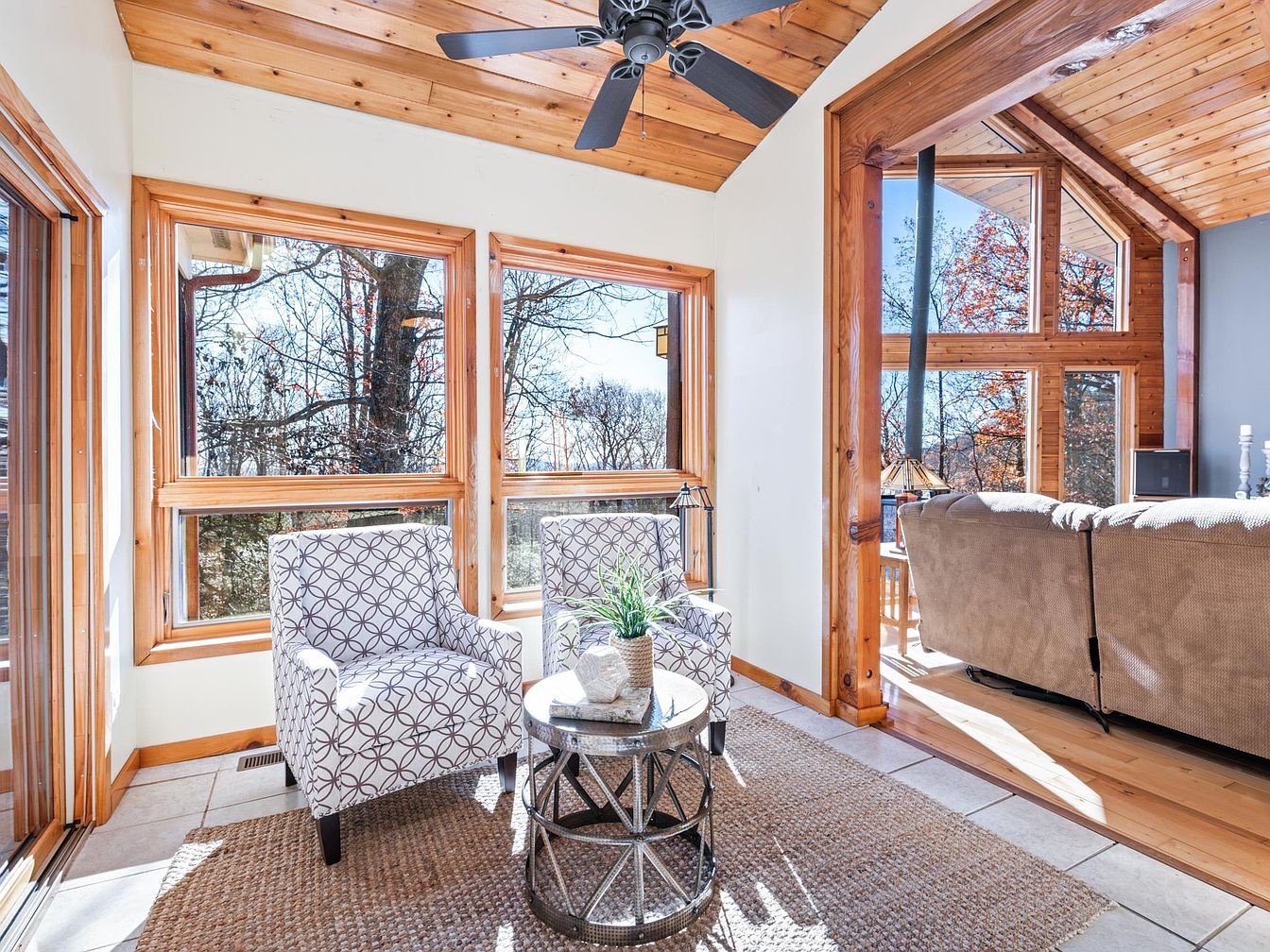 A cozy sunroom seamlessly connects to the living room, offering a relaxing family retreat surrounded by natural light. Large windows framed with natural wood capture panoramic views of the outdoors, creating an airy and inviting atmosphere. Two patterned armchairs sit atop a textured jute rug, paired with a small round table for casual chats or reading. The wood-paneled ceiling and exposed beams add rustic warmth, tying in with the honey-toned hardwood floors visible through the open archway. This space is perfect for family gatherings, enjoying morning coffee, or basking in the sunlight during quiet afternoons.