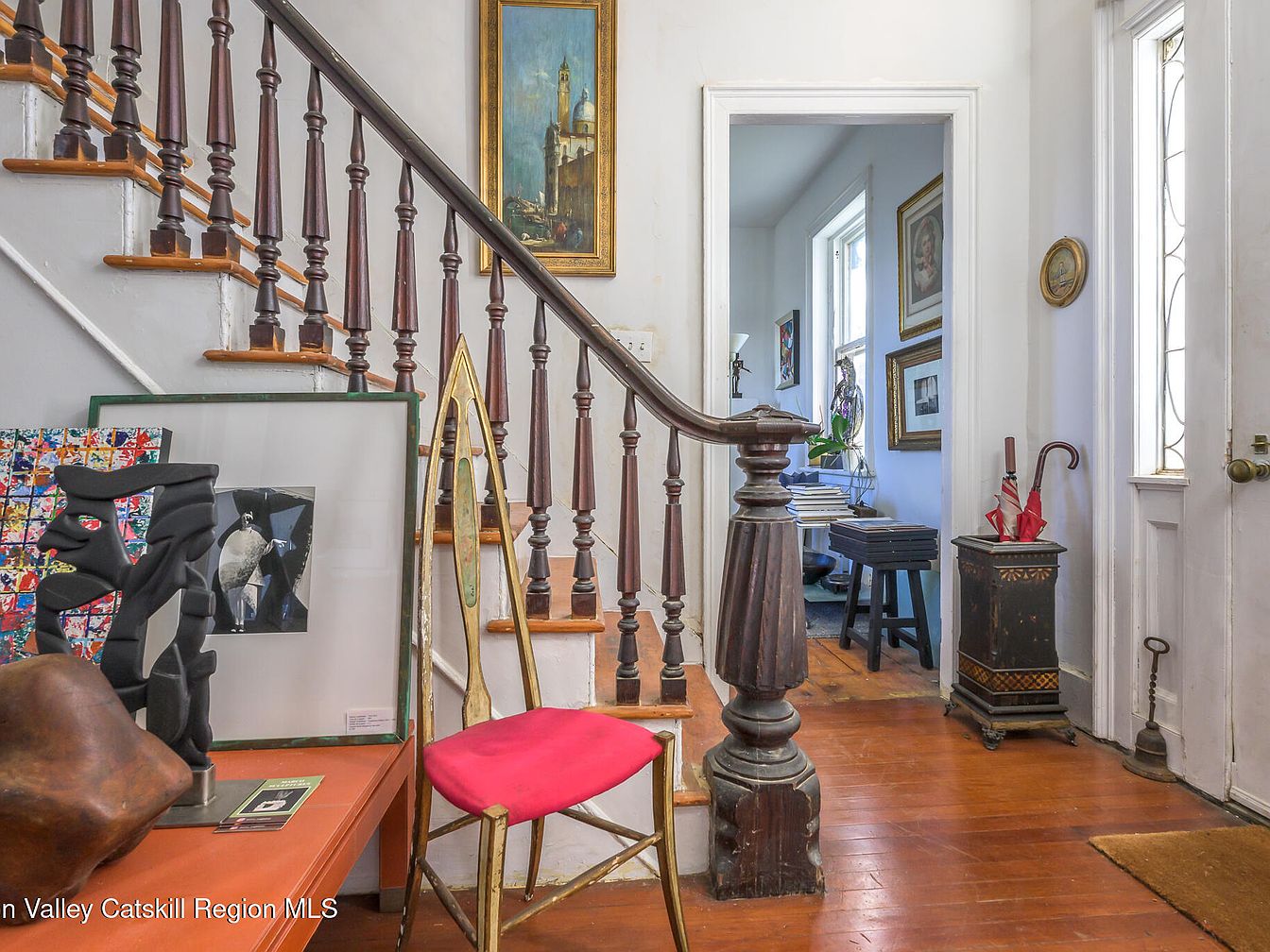 The entryway features a classic staircase with intricately turned spindles leading to the upper floor, creating a warm and welcoming atmosphere. The rich wooden steps emanate a rustic charm, enhanced by the polished finishes. A vibrant pink accent chair paired with artistic sculptures adds a touch of contemporary elegance. Framed artwork on the walls injects personality into the space, inviting creativity and conversation. Large windows allow natural light to wash in, illuminating the artistic elements and creating an airy feel. This thoughtfully designed area seamlessly combines family-friendly comfort with striking aesthetic details, setting a captivating tone for the home.