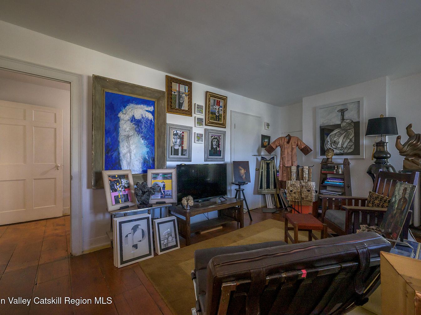 This inviting living room features a harmonious blend of contemporary art and classic charm, showcased through vibrant wall decor. Rich wooden floors complement the neutral color palette, creating a warm atmosphere. Comfortable seating, including a dark leather armchair and wooden rocking chair, encourages family gatherings. The arrangement of framed artwork and unique sculptures adds character, sparking conversation. An entertainment unit anchors the space, while strategic lighting enhances the room’s cozy feel. The thoughtful layout balances aesthetics with functionality, making it perfect for relaxation and entertaining guests, establishing a delightful haven for any family.