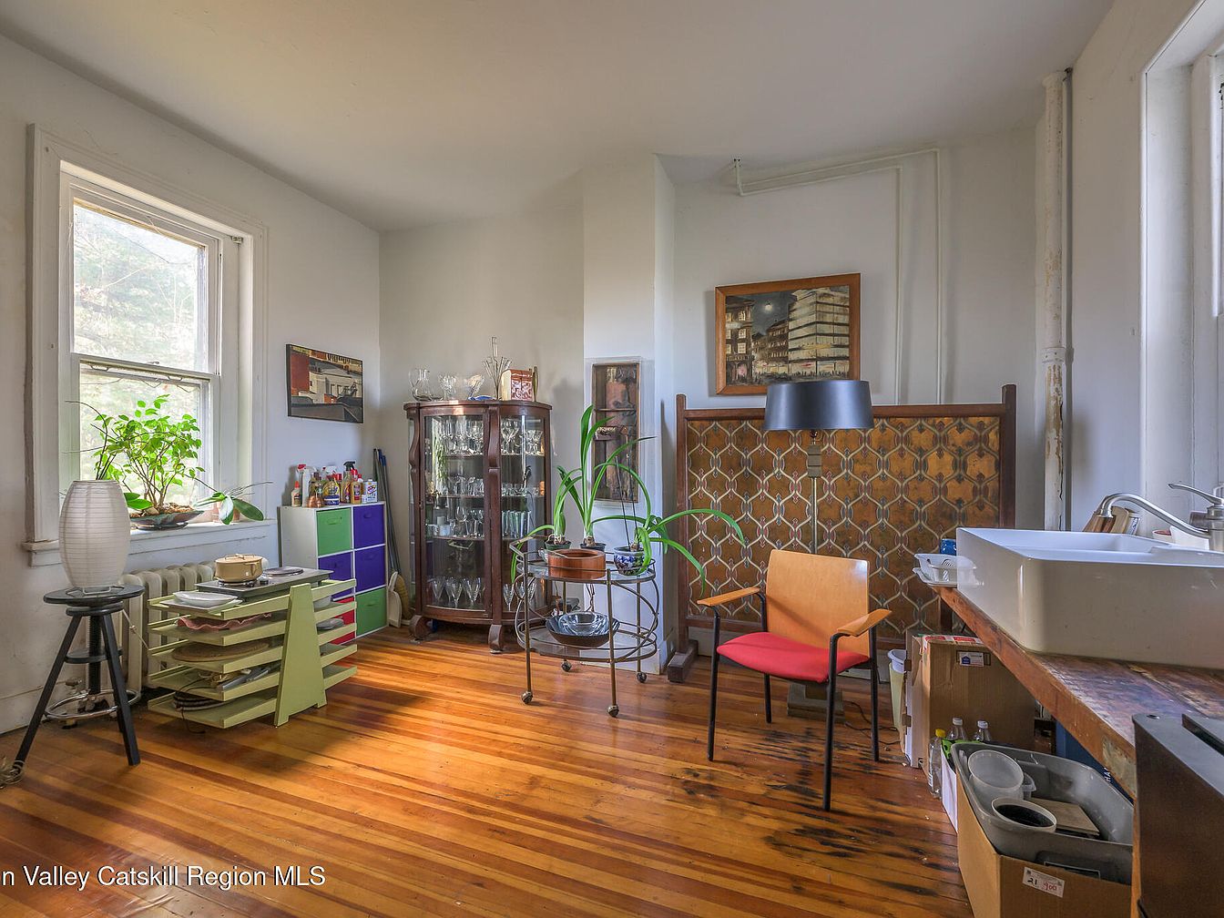 This inviting dining nook showcases a blend of functionality and charm. Warm wood flooring sets a cozy tone, complementing the soft natural light streaming through the sizable windows. A simple wooden table is paired with modern, colorful chairs, providing a lively touch. Eye-catching decor, including a vintage glass display cabinet and lively potted plants, adds personal flair. The layered textures—such as the wooden wall partition and sleek kitchen counter—create a welcoming atmosphere. This space is perfect for family gatherings, encouraging casual dining experiences while also showcasing a curated selection of glassware and artwork, blending contemporary and classic elements.