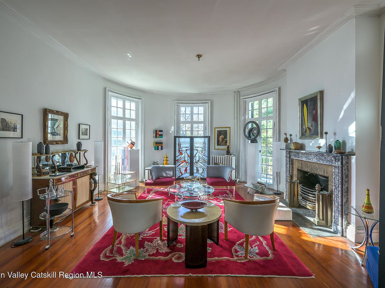 This inviting living room combines vibrant colors with eclectic decor, fostering a creative atmosphere. The circular layout enhances the flow of the space, while large windows flood it with natural light. A rich, patterned rug anchors the room, complemented by bold art pieces displayed on the walls. Furniture pieces include comfortable chairs and a sleek coffee table, ensuring a welcoming environment for family gatherings. The light color palette contrasts beautifully with pops of orange and green, creating a lively yet cozy feel. Architectural details like the classic fireplace and unique ceiling add character and charm.