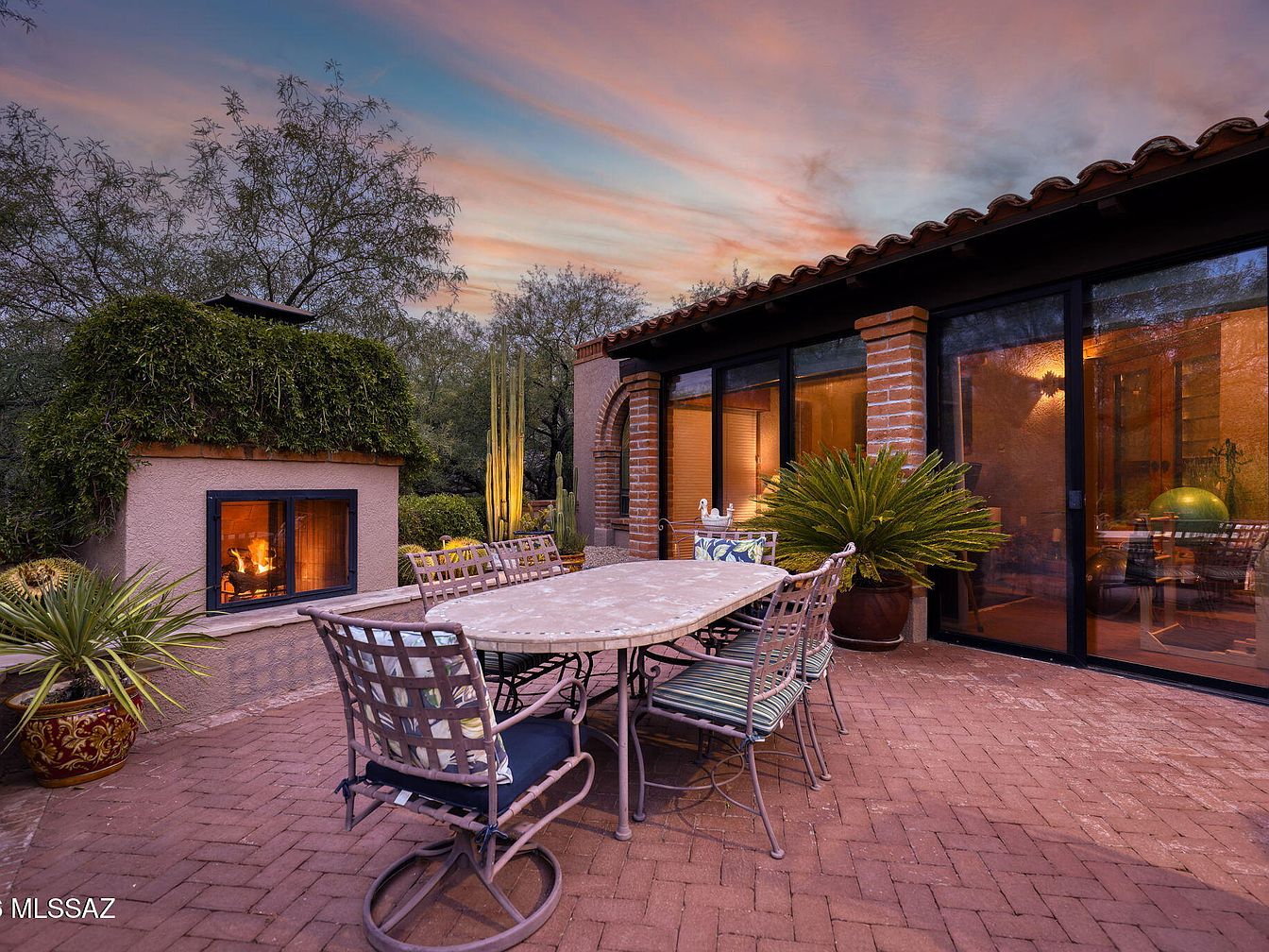 This exquisite outdoor patio combines cozy elegance with family-friendly functionality. A spacious dining table, surrounded by comfortable, stylish chairs, invites gatherings under the warm twilight sky. The paved brick flooring leads to a charming fireplace, perfect for cool evenings, while vibrant planters and lush greenery create a serene atmosphere. The adjoining retreat, highlighted by glass doors, seamlessly merges indoor and outdoor living, allowing natural light to flood this inviting space. The earthy color palette, accentuated by rich browns and refreshing greens, enhances the patio’s warmth, making it an ideal setting for relaxation or memorable family moments.