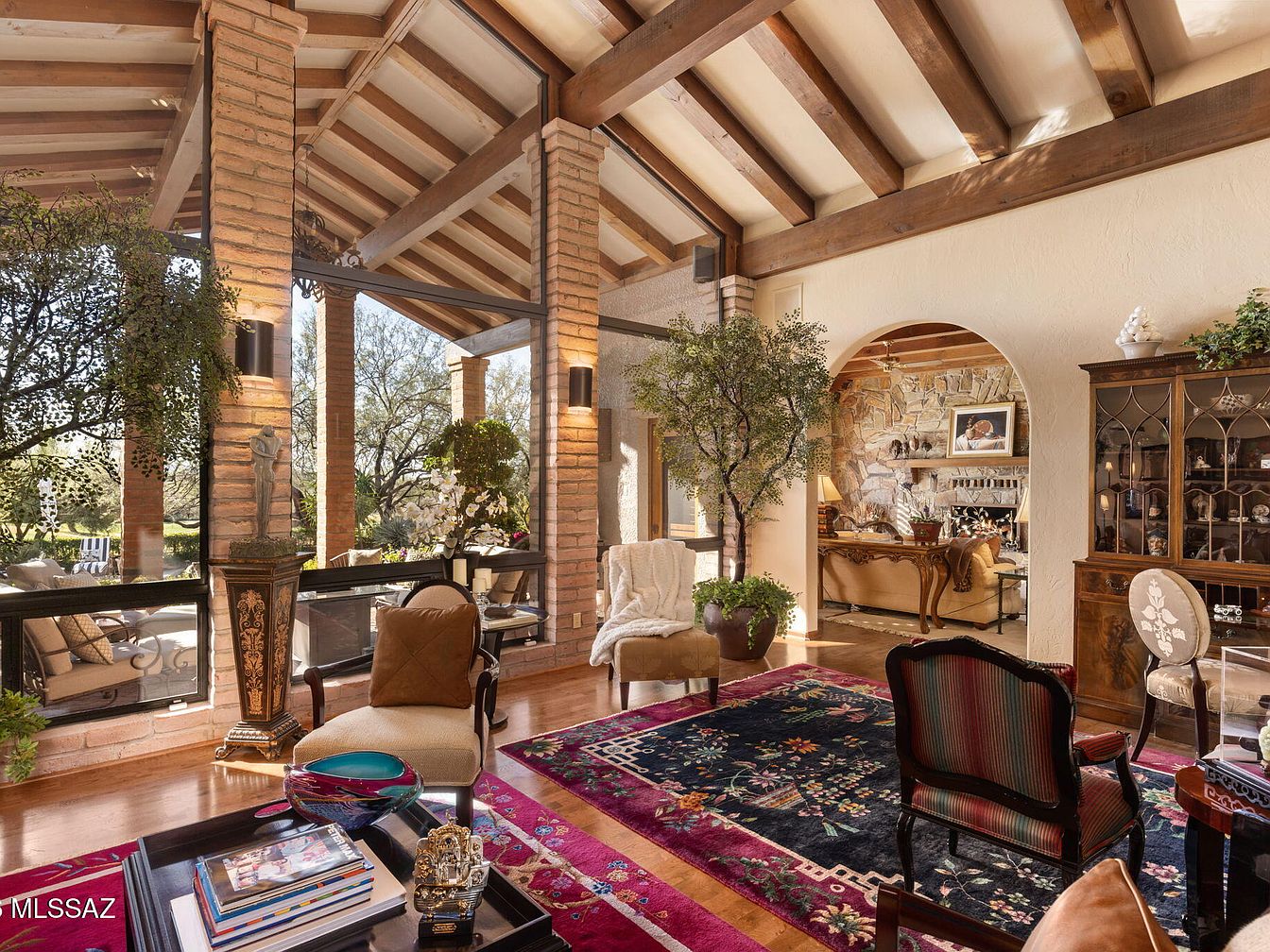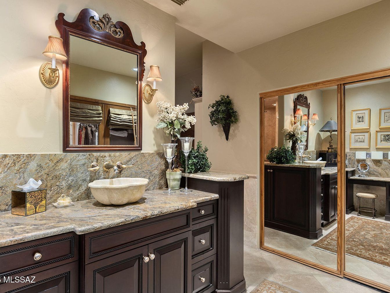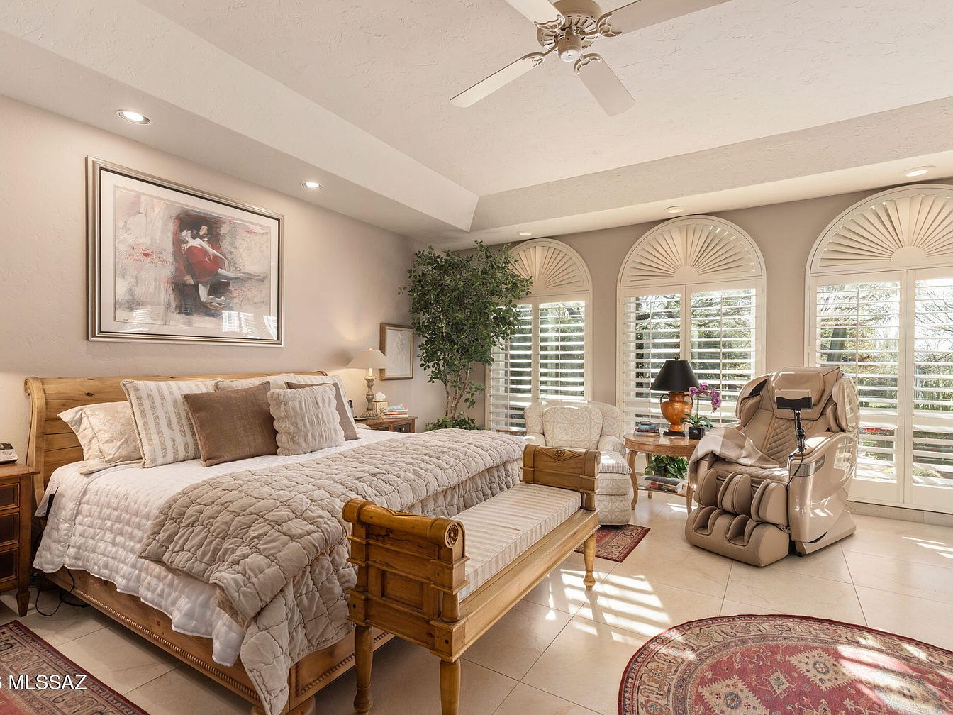This stunning slump block home built in a sought-after neighborhood of Tucson, AZ, exudes both historical significance and modern luxury. Perfectly suited for success-oriented individuals, it features a gourmet kitchen, expansive primary suite, and mesmerizing outdoor spaces, including a pool and hot tub, ideal for entertaining. The home’s architectural style seamlessly blends indoor and outdoor living with wood-beamed ceilings and an inviting courtyard, symbolizing tranquility and sophistication. Set on a golf course within a guard-gated community, the property boasts 4,335 sq ft on a generous plot, with a listing price of $1,895,000. Recent renovations enhance its appeal, aligning perfectly with a future-focused lifestyle.