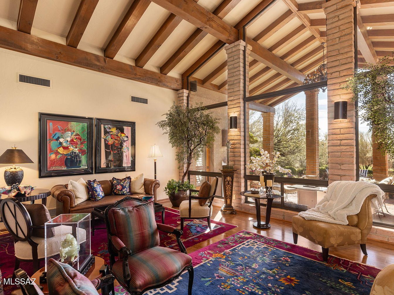 This inviting living room features a stunning blend of contemporary and traditional design. Exposed wooden beams stretch across the ceiling, enhancing the spacious feel, while large windows invite natural light and showcase the lush outdoor landscape. The rich color palette includes deep reds and earthy tones, complemented by plush seating adorned with decorative pillows. Artistic wall hangings add a personal touch, creating a warm ambiance. Family-oriented features include a comfortable layout ideal for gatherings, while elegant accents such as a glass table and tasteful decor pieces further enhance the sophisticated yet cozy atmosphere, making it perfect for relaxation.