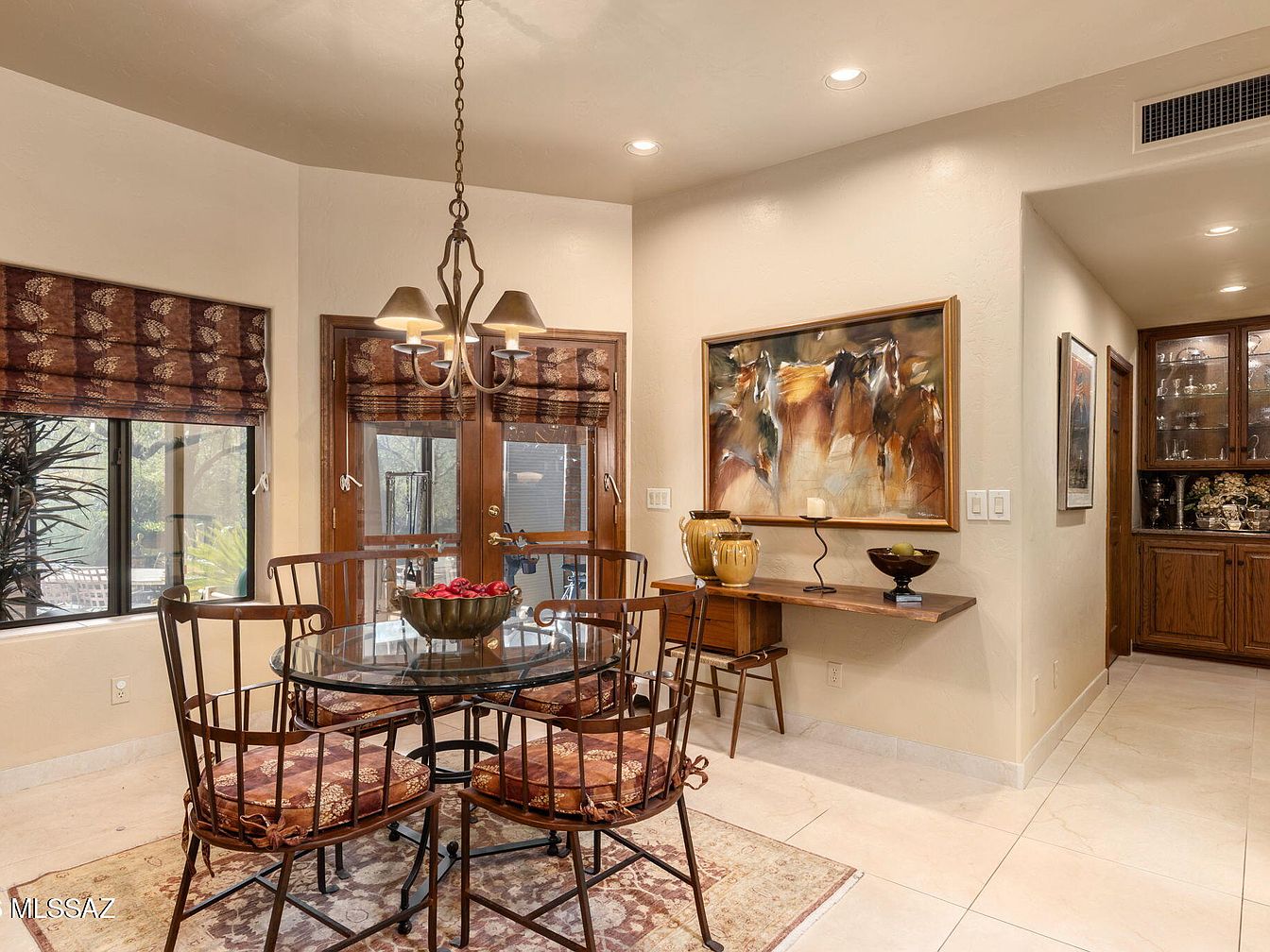 This inviting dining area features a glass-top round table surrounded by elegant wrought-iron chairs with plush cushions, providing comfort for family gatherings. The warm color scheme of soft beiges and deep browns creates an airy atmosphere, enhanced by natural light streaming through the wide windows adorned with rich fabric shades. Artistic wall decor adds character, while the adjacent built-in cabinetry showcases both functionality and style. A stylish light fixture hangs above the table, offering soft illumination, making it perfect for family meals or intimate dinners. This space exemplifies comfort and sophistication, ideal for everyday living.