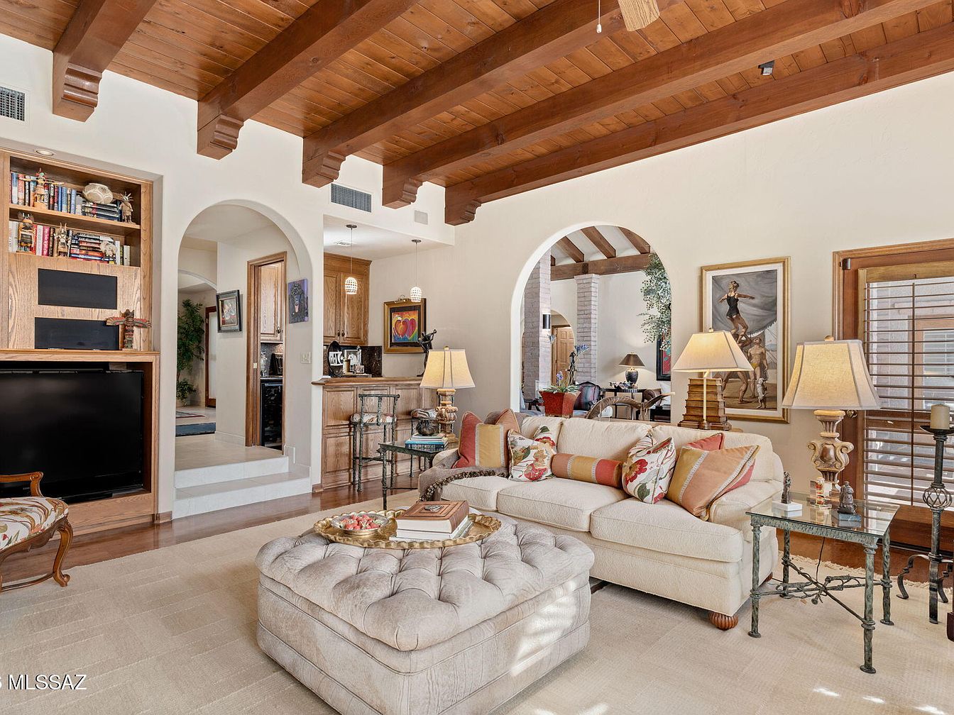 This inviting living room features a warm atmosphere accentuated by rich wooden beams overhead and a plush, tufted ottoman at center stage. Light-colored sofas adorned with decorative pillows invite relaxation, complemented by contemporary glass side tables that add elegance. Arched doorways and built-in bookshelves showcase thoughtful architectural details while maintaining an open layout that promotes family gatherings. The warm, neutral color scheme enhances the cozy vibe, while the soft interplay of natural light creates an inviting ambience. Touches of art and greenery unite decor elements, making it a perfect retreat for family and friends.