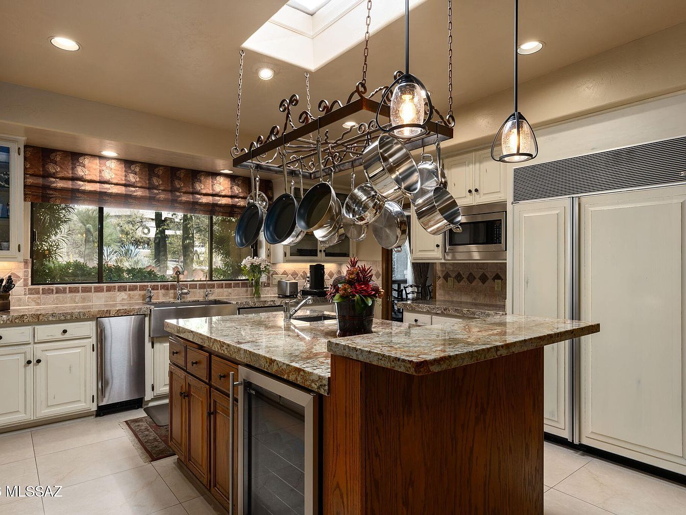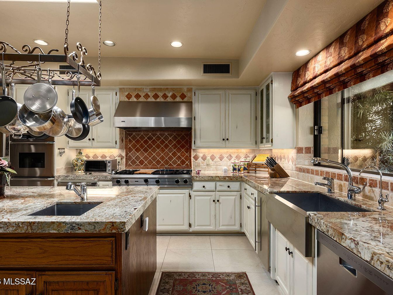 A beautifully crafted kitchen featuring a central island anchored by rich wooden cabinetry. The stunning granite countertops blend elegance with functionality, providing ample space for food preparation and gatherings. Above, a custom pot rack enhances the culinary atmosphere, while stylish pendant lights add warmth and ambiance. Large windows allow natural light to flood the space, offering picturesque views of the surrounding garden. The backsplash combines earthy tones with decorative tiles, complementing the overall color palette of soft whites and warm browns. Stainless steel appliances and thoughtful touches create a family-friendly space perfect for cooking and entertaining.