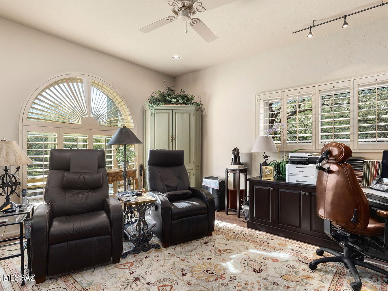 This inviting home office features a thoughtful blend of comfort and functionality. Sunlight pours through a grand arched window, adorned with elegant shutters that provide privacy while framing lush outdoor views. Two plush leather recliners invite relaxation, positioned near a decorative lamp and an intricate side table. A rich, dark wood desk hosts modern office equipment, complemented by an ergonomic chair, enhancing productivity. A tasteful area rug adds warmth, while a pop of greenery from potted plants brings life to the space. Subtle architectural details, like the ceiling fan and crown molding, contribute to the airy ambiance, ideal for family collaboration.