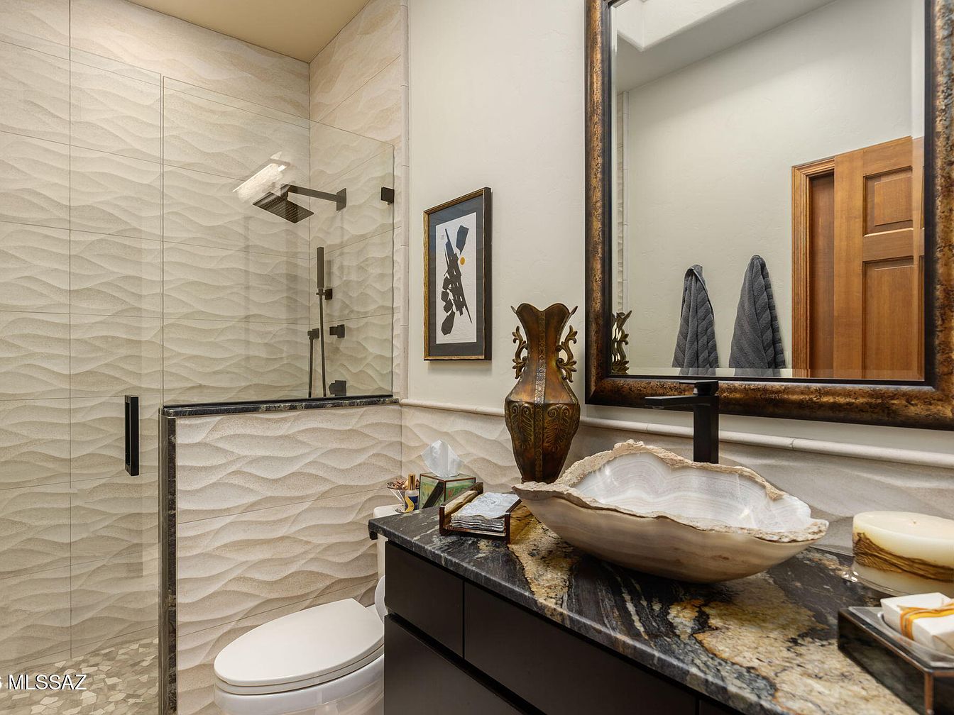 This elegant bathroom blends modern design with warm aesthetics. The spacious shower, framed by frosted glass, showcases a sleek rainfall showerhead and textured wall tiles that create a soothing ocean wave effect. A dark wood vanity provides contrast against the light sandy tones of the walls, accentuated by a luxurious granite countertop. An eye-catching natural stone sink adds a touch of artistry, while the ornate vase and art pieces lend character. Family-friendly features include ample storage and easy-to-clean surfaces, ensuring functionality without sacrificing style. Soft lighting enhances the space, making it a perfect retreat for relaxation.