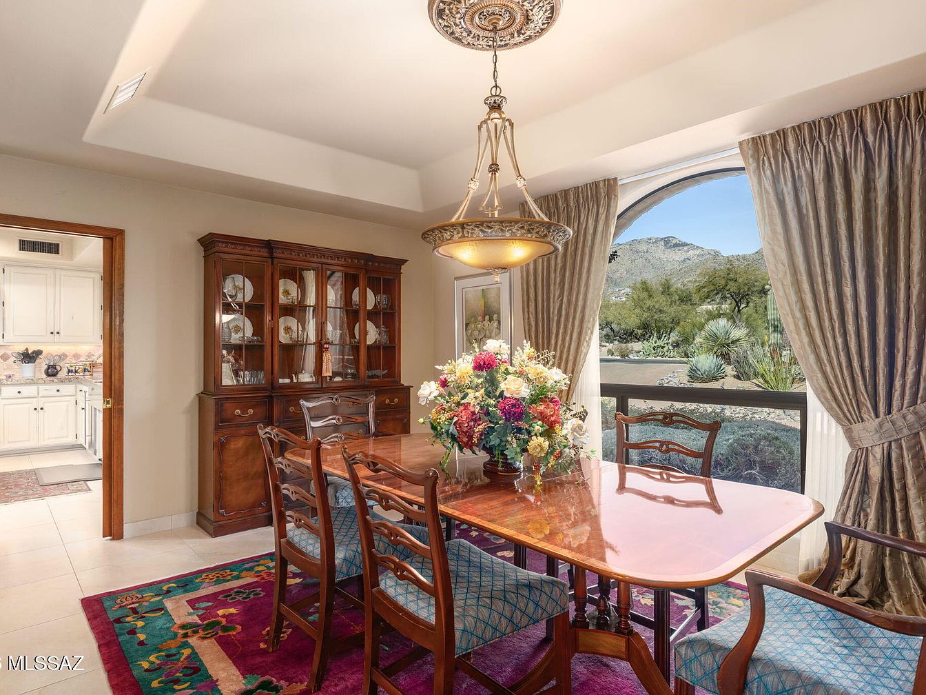 The dining room features a beautifully polished wooden table surrounded by intricately designed chairs, perfect for family gatherings. Rich, colorful patterns adorn the dining chairs, complementing the vibrant area rug beneath. A grand wooden china cabinet displays fine dinnerware while adding warmth to the space. The ceiling showcases an elegant light fixture, enhancing the inviting atmosphere. Soft, flowing curtains frame the large arched window, offering stunning views of the surrounding nature. Neutral wall colors create a calming backdrop that allows the furnishings to shine, blending sophistication with a welcoming family-friendly vibe, ideal for hosting memorable meals.