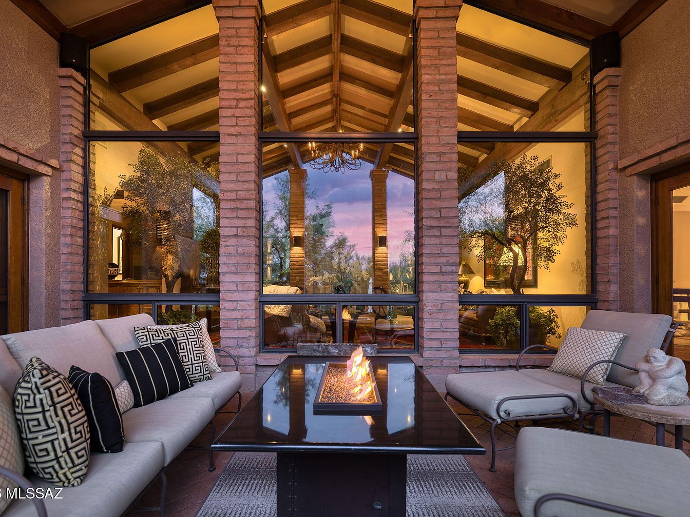 This inviting patio lounge area blends indoor comfort with outdoor charm, featuring expansive glass walls that frame breathtaking views. Rustic brick columns support a vaulted ceiling adorned with wooden beams, creating a warm, airy ambiance. A sleek, modern fire pit takes center stage, surrounded by plush seating adorned with stylish patterned cushions. The outdoor decor is tastefully complemented by carefully placed potted plants, enhancing the natural aesthetic. The color palette embraces earthy tones with soft neutrals and pops of black, ensuring a sophisticated yet relaxing atmosphere perfect for family gatherings and tranquil evenings alike.