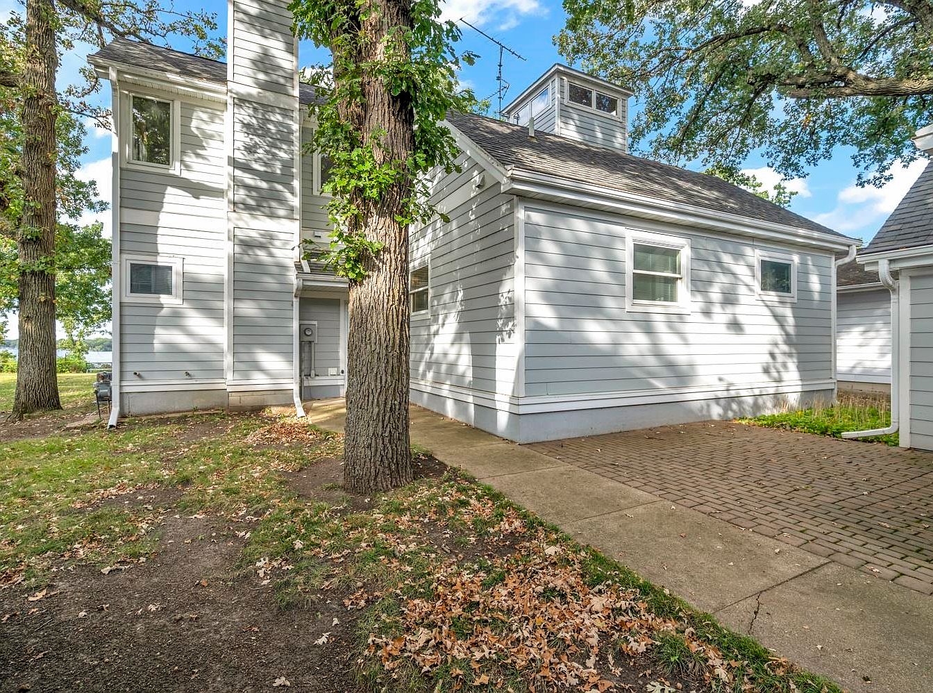 This charming American home showcases a harmonious blend of modern design and natural surroundings. The light gray siding is complemented by white trim, creating a fresh and inviting aesthetic. The layout features a wide driveway made of interlocking pavers, leading to a side entry that enhances accessibility. Lush green lawns and mature trees provide both shade and beauty, ensuring a family-friendly environment. Large windows allow abundant natural light, brightening the indoor spaces while connecting the home with the outdoors. The peaked roofline and chimney add a touch of classic architectural detail amid a serene landscape.