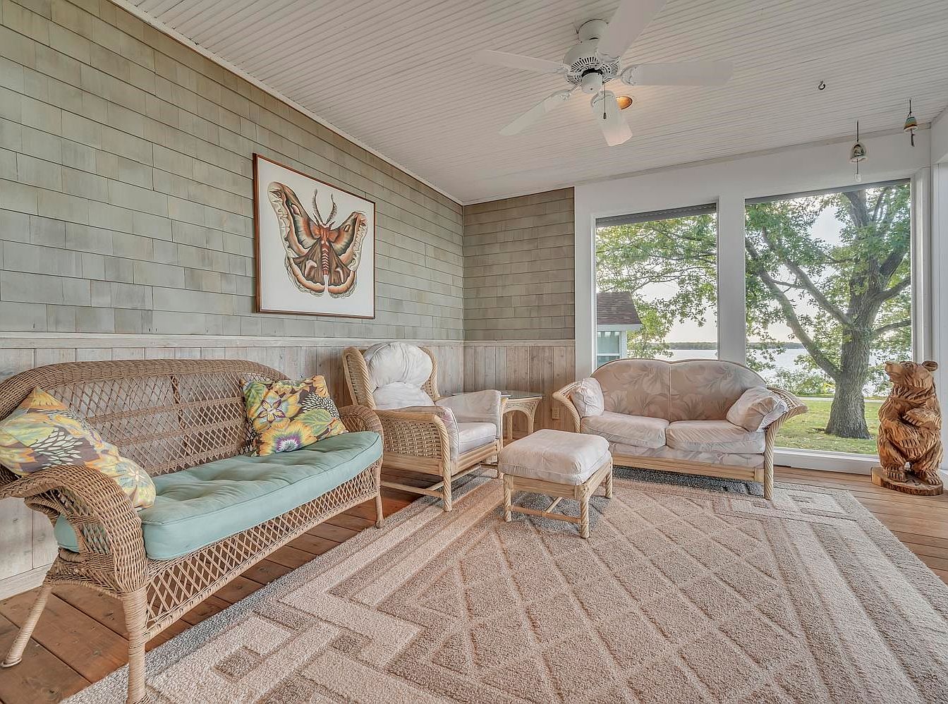 This charming sunroom showcases a blend of comfort and tranquility, ideal for family gatherings or solo relaxation. Soft, natural light floods the space through large windows, allowing serene views of the surrounding greenery and water. The wood-paneled walls in muted tones harmonize beautifully with the whimsical butterfly artwork, enhancing the cozy ambiance. Rustic wicker furniture, adorned with vibrant floral cushions, offers a welcoming seating arrangement, complemented by a plush area rug that adds warmth. A ceiling fan provides a gentle breeze, ensuring enjoyment throughout the seasons. This spot truly embodies a peaceful retreat for any home.