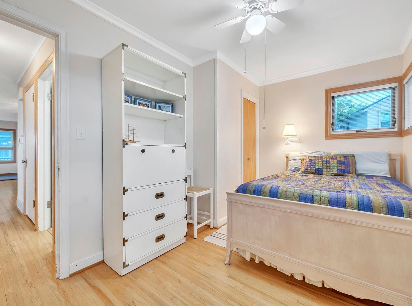 This cozy bedroom showcases a warm and inviting atmosphere, perfect for restful nights. The room features a light color palette with soft beige walls that complement the natural light streaming in through the window. A beautifully crafted wooden bed stands at the center, adorned with a vibrant, patterned quilt adding a splash of color. A charming white dresser with brass accents provides ample storage while enhancing the room’s aesthetic. Nearby, a small chair and a stylish lamp create a reading nook, making this space not only functional but also family-friendly. A sleek ceiling fan adds comfort and elegance.