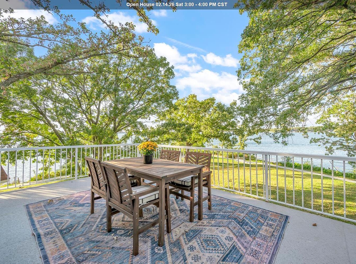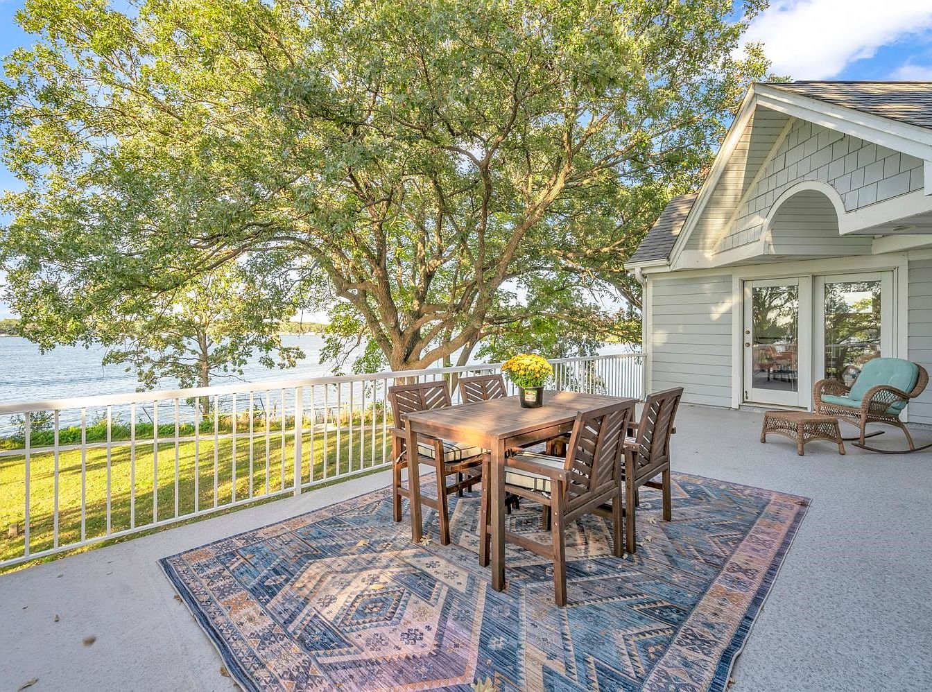 This inviting patio area features a charming wooden dining table surrounded by comfortable, cushioned chairs, perfect for family gatherings. The natural wood finishes complement the vibrant colors of the surrounding landscape, where lush greenery and a sparkling water view provide a serene backdrop. Underfoot, a beautifully patterned area rug adds warmth and texture to the space, while the railing ensures safety without blocking the picturesque scenery. A potted flower brightens the table, enhancing the outdoor ambiance. This setup is ideal for enjoying meals or morning coffee, making it a family-friendly retreat for relaxation and socializing.