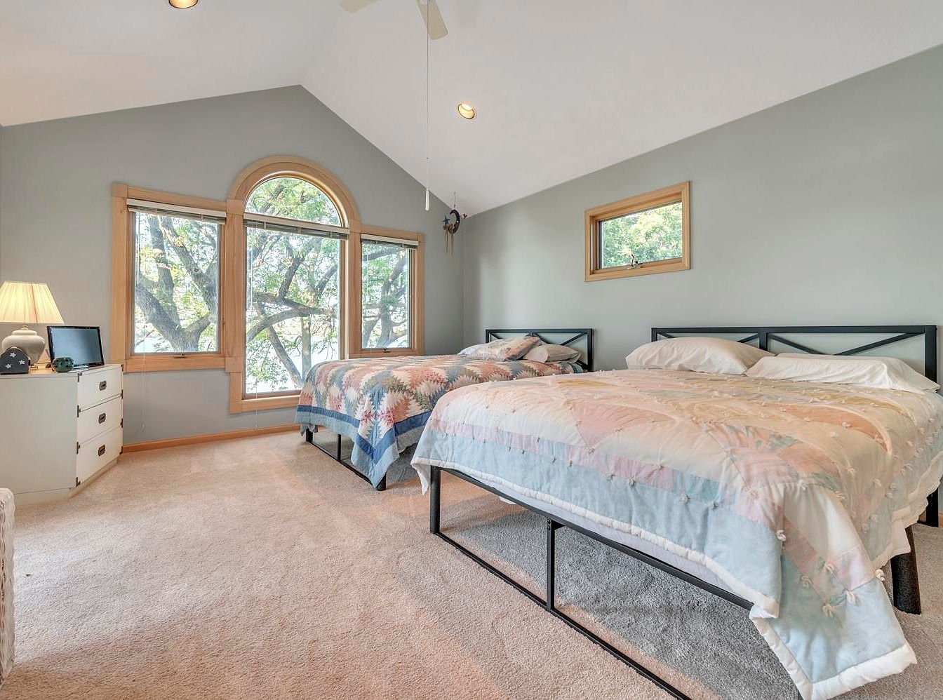 This inviting guest bedroom features a spacious layout accentuated by a vaulted ceiling that enhances the airy feel. Large, picturesque windows frame the outdoor views, inviting natural light to illuminate the soft gray walls. Two beds adorned with pastel-colored quilts offer comfort and charm, both easily accessible and ideal for family gatherings. A compact dresser provides convenient storage, while the plush carpet underfoot adds warmth. Architectural details include wooden window frames that complement the overall aesthetic. The serene color palette promotes relaxation, making this room a perfect retreat for guests of all ages.