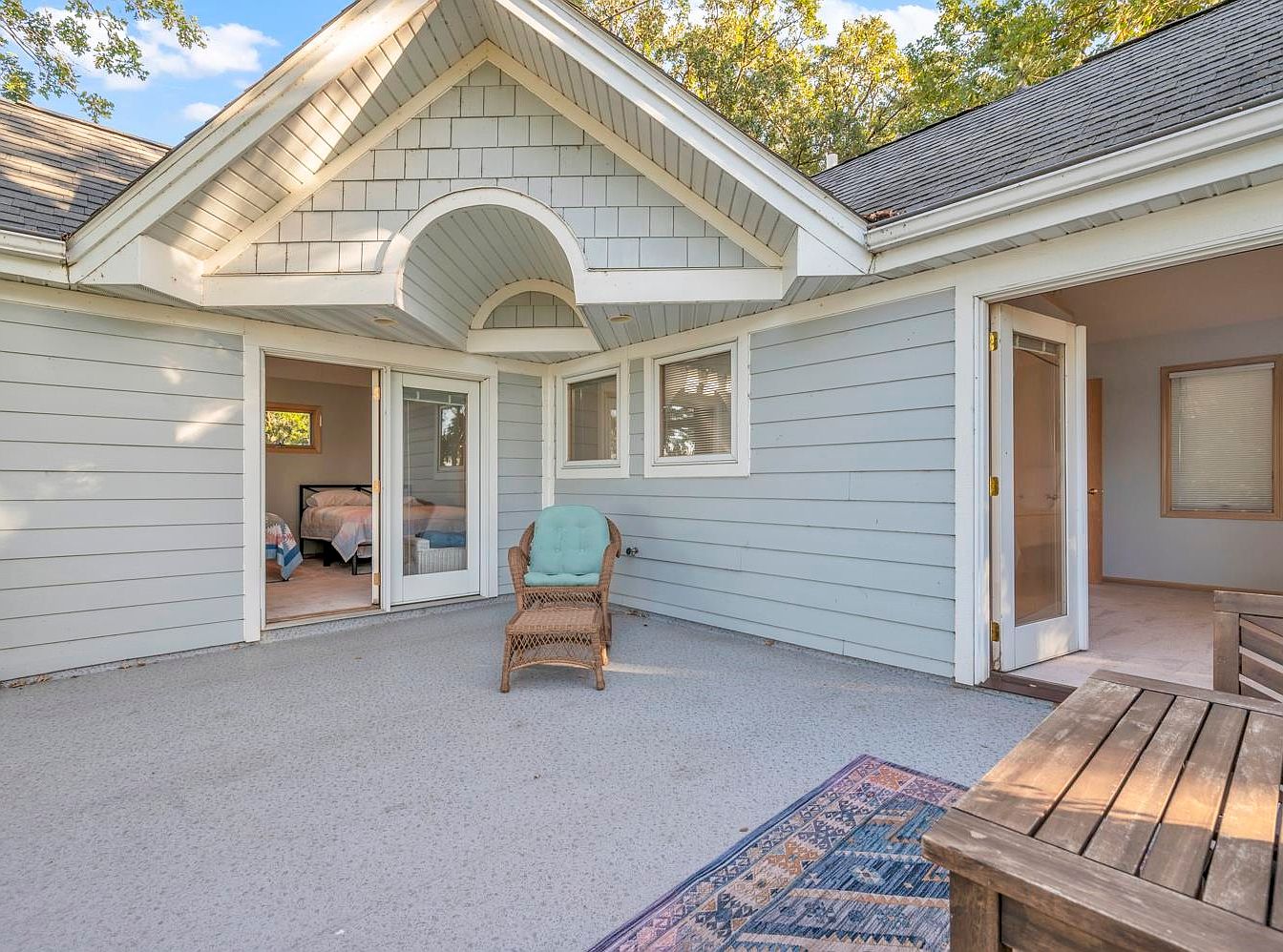 This inviting outdoor patio seamlessly merges indoor and outdoor living. The light blue siding and well-crafted architectural elements, including a peaked roof and large windows, create a harmonious and welcoming aesthetic. A classic wicker chair, adorned with a soft cushion, offers a comfortable seating option, perfect for relaxation. Natural light floods the space, enhancing the airy feel, while the neutral flooring complements the cozy vibe. A rustic wooden table provides an ideal setting for family gatherings or casual meals. The subtle color palette and thoughtful layout emphasize a warm, family-friendly atmosphere that encourages connection.