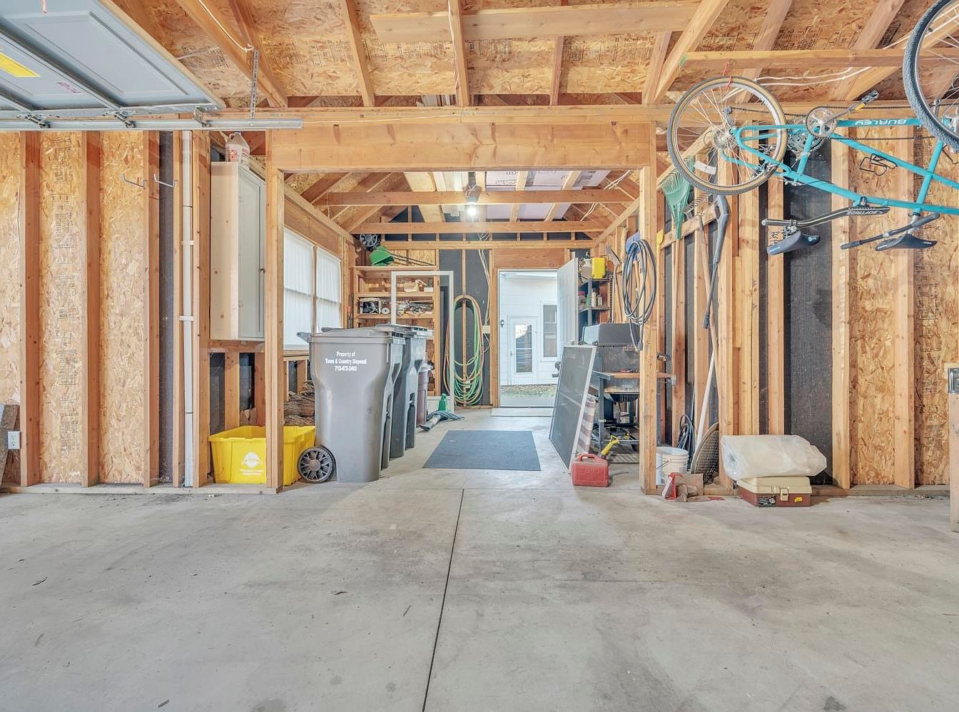 This garage features an open layout with ample storage and organization possibilities. Constructed with exposed wooden beams and raw materials, the aesthetic embraces a rustic yet functional charm. The concrete flooring provides durability, while the natural light pouring in from the windows enhances the space. Family-friendly features are evident with designated recycling bins and a hanging bike rack, promoting an active lifestyle. Various tools and gardening supplies find a home on wall-mounted shelves, keeping everything within easy reach. The neutral color scheme of wood and concrete contributes to a clean and practical environment, perfect for every household.