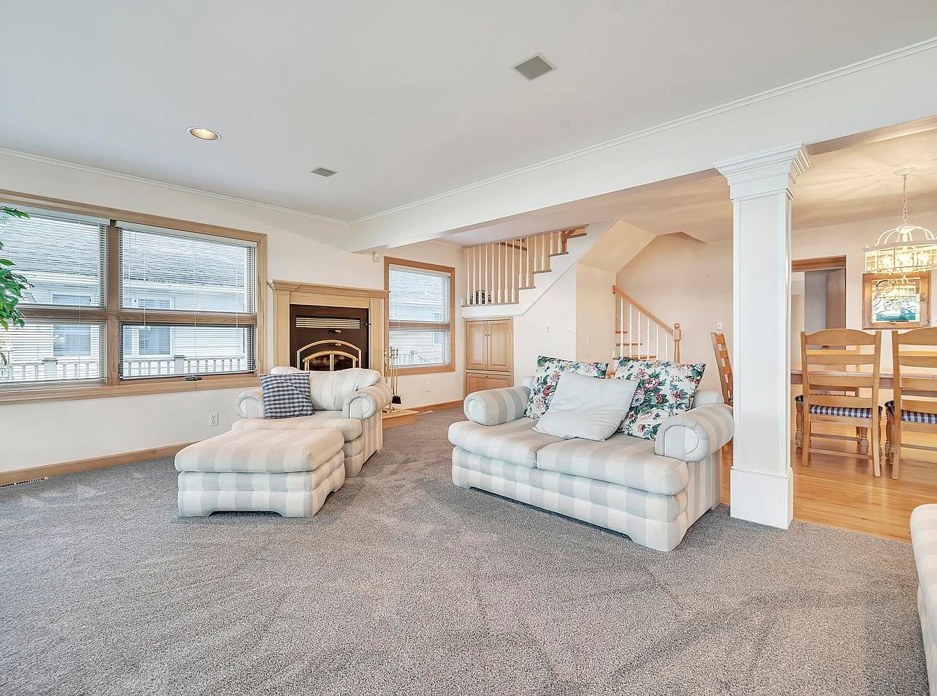 This inviting living space merges comfort and style, featuring plush, striped sofas adorned with floral throw pillows that add a touch of warmth. Natural light floods through large, double-hung windows, illuminating the soft carpeting and enhancing the open layout. A classic fireplace serves as a focal point, providing both charm and functionality, ideal for family gatherings. The space is framed by elegant columns, leading to a staircase that adds architectural interest. Soft, neutral tones combined with touches of color create a welcoming atmosphere, making it the perfect spot for relaxation or entertaining guests.