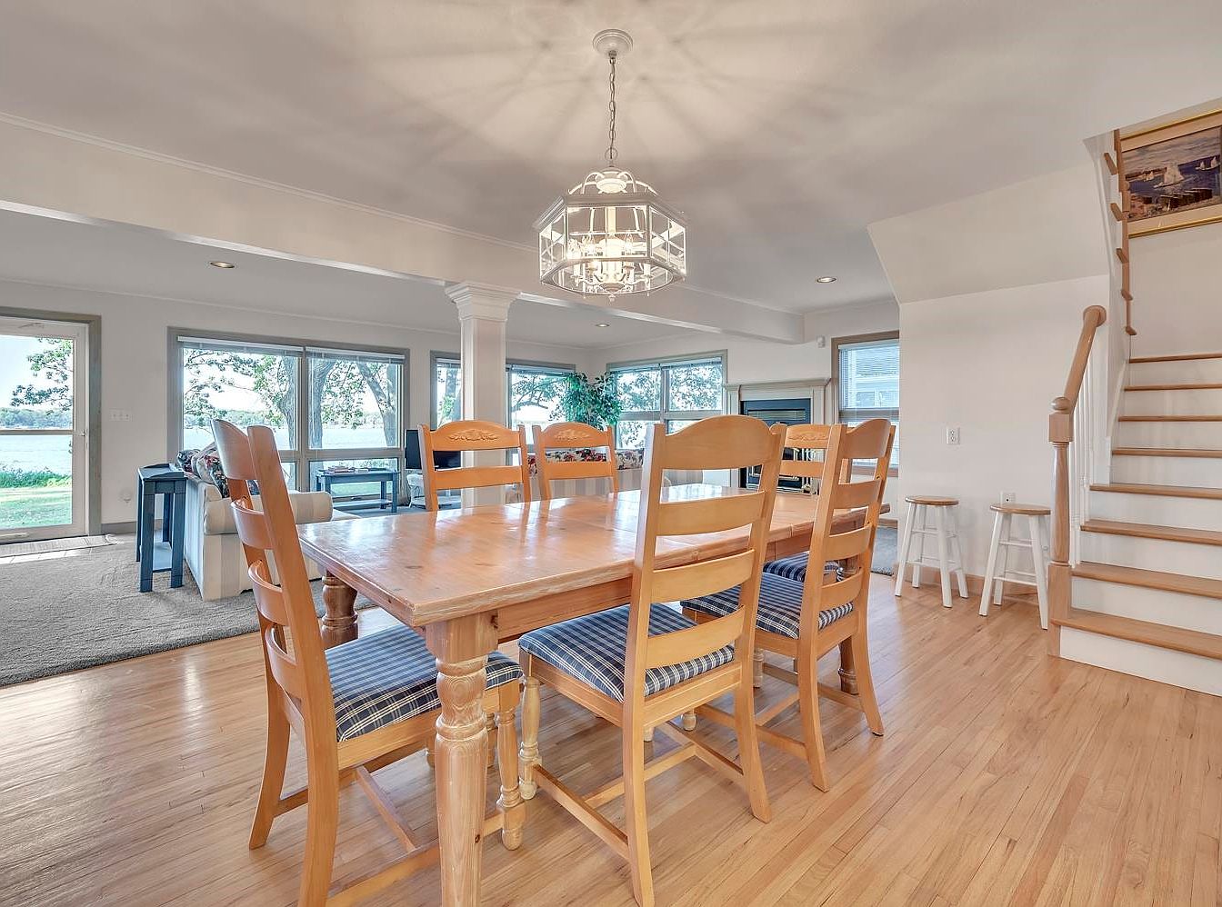 This inviting dining area features a spacious wooden table surrounded by sturdy chairs, making it perfect for family gatherings. The natural wood finish harmonizes with the warm tones of the hardwood floor, while the blue and white striped seat cushions add a touch of nautical charm. A stylish pendant light hangs above, illuminating the space elegantly. Large windows frame picturesque views of the outdoors, creating a bright and airy ambiance. The open-concept layout connects seamlessly to the adjoining living space, fostering a sense of community. Ideal for entertaining, this area emphasizes comfort and style in a family-friendly environment.