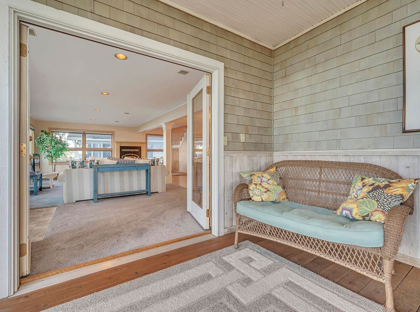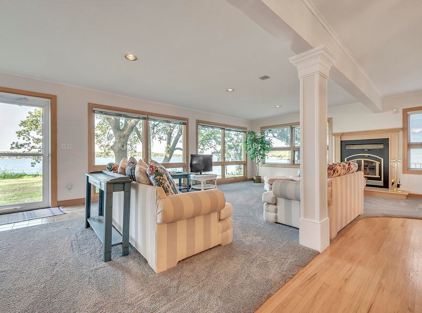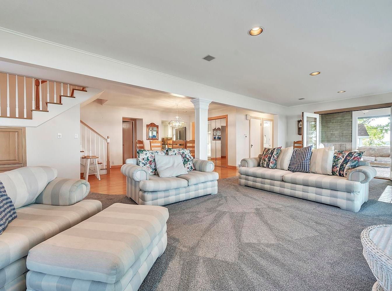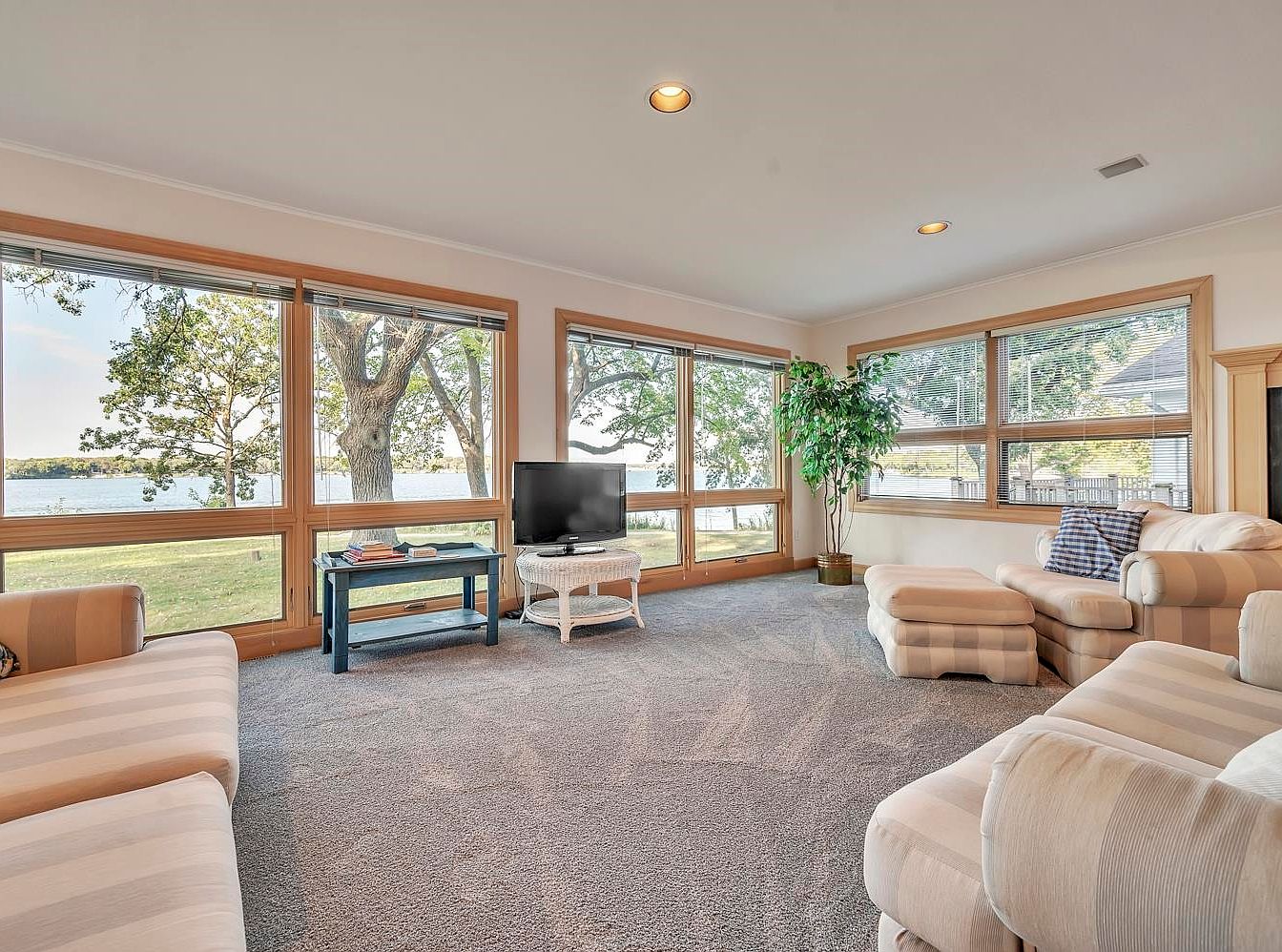 Oversized windows frame stunning views of the water, filling this spacious sunroom with natural light. Soft, neutral tones dominate the color palette, creating a serene atmosphere. Plush, striped sofas invite relaxation, while a cozy armchair and a small blue coffee table add charm. The plush carpet beneath provides warmth and comfort, making it an ideal space for family gatherings or quiet afternoons. A decorative potted plant enhances the inviting ambiance, merging indoor comfort with outdoor beauty. Thoughtful architectural details such as wood trim and recessed lighting elevate the room, offering a perfect blend of style and functionality.