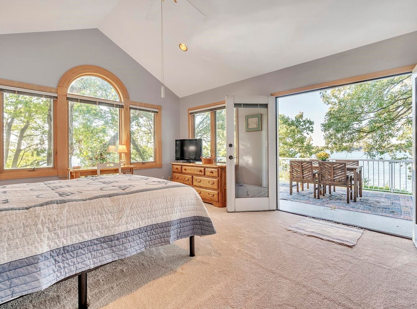 This master bedroom features a spacious and inviting layout, accentuated by a soaring vaulted ceiling that enhances the sense of openness. Large, arched windows framed in natural wood provide abundant natural light and picturesque views of the surrounding greenery, creating a tranquil atmosphere. The color scheme, comprising soft blues and neutral tones, complements the plush carpet and elegant bedding, promoting relaxation. A classic wooden dresser and a small desk with a lamp are thoughtfully placed for convenience. The seamless transition to a private balcony invites outdoor living, perfect for morning coffee or evening gatherings.