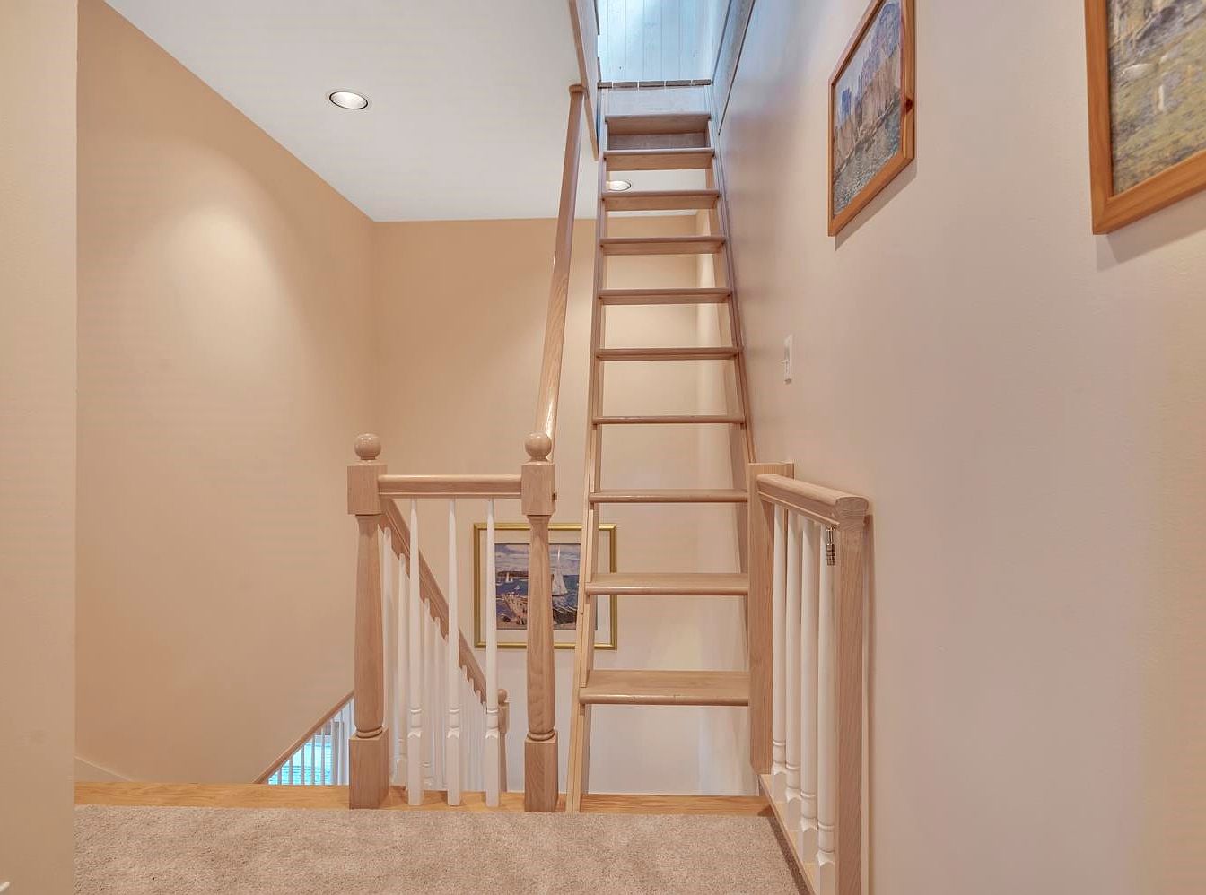 This inviting staircase features a clean design with natural wood accents, providing a warm transition between spaces. The light beige walls complement the soft gray carpet, creating a serene atmosphere. Simple yet elegant banisters and railings are crafted from smooth wood, ensuring safety while adding a touch of sophistication. Framed artwork adorns the walls, enhancing the overall aesthetic and giving glimpses of personality. Natural light streams in from above, illuminating the path and making it feel bright and airy. This family-friendly design effortlessly combines comfort, style, and practicality, perfect for everyday use.