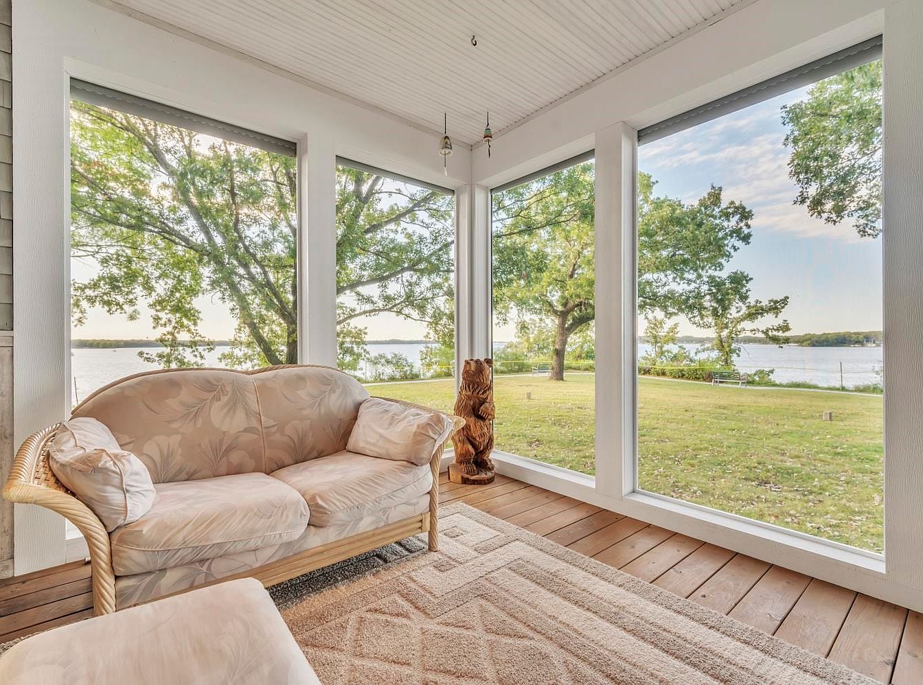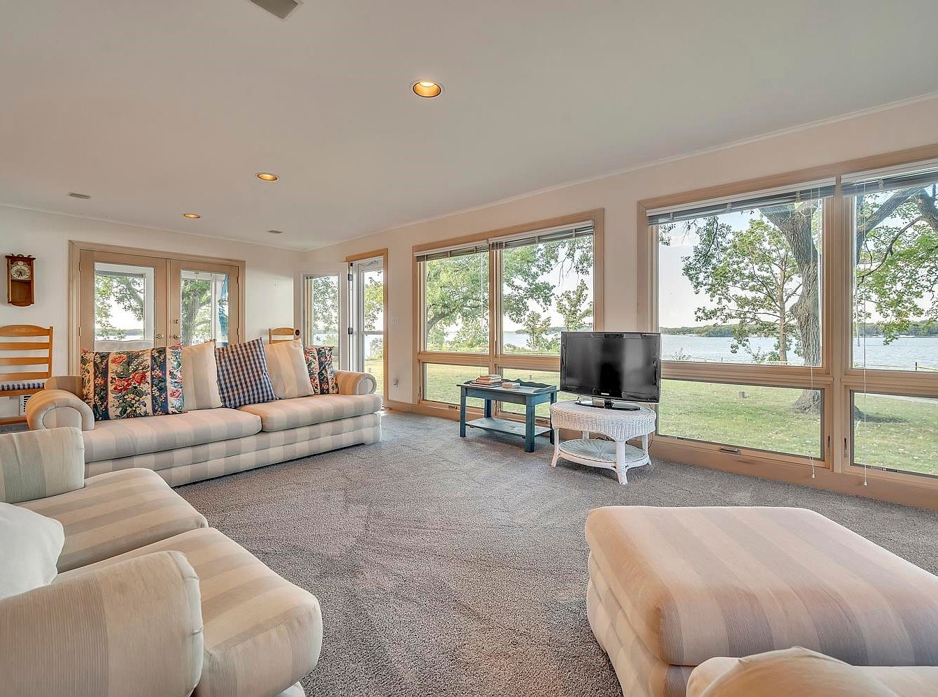 This inviting living room features expansive windows that provide stunning views of the serene outdoors, enhancing the space with natural light. The soft, plush carpet offers a warm, family-friendly environment, perfect for gatherings. A comfortable plaid sectional and upholstered chairs with floral accents create a relaxed atmosphere, inviting cozy moments. The subtle pastel color scheme, coupled with light wood accents, brings a touch of elegance and tranquility. A flat-screen TV is neatly positioned on a white wicker stand, while a quaint coffee table adds functionality without detracting from the picturesque lakeside backdrop.