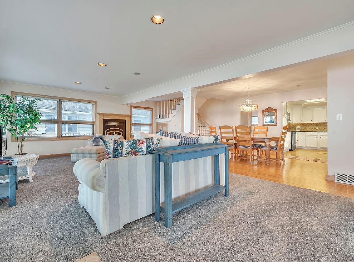 This inviting living room exudes warmth and charm, perfect for families seeking comfort. The spacious layout features plush striped sofas adorned with floral throw pillows, inviting relaxation. A soft carpet underfoot enhances the cozy atmosphere, while a central pillar adds architectural interest. Light streams in through generous windows, creating an airy feel and offering scenic views. The subtle color palette combines soft grays and creams, harmonizing beautifully with the wooden accents seen in the adjacent dining area. This room is designed for gatherings, fostering connection and cherished memories, making it a quintessential family-friendly space.