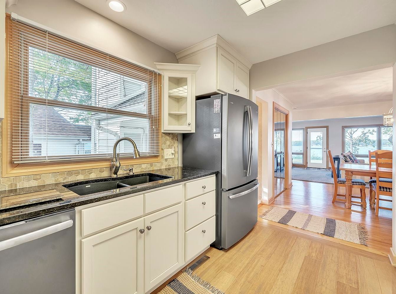This inviting kitchen features a contemporary design with rich, dark granite countertops complemented by crisp white cabinetry. A large window invites natural light while showcasing a view of the outdoors, enhancing the space’s airy feel. Stainless steel appliances, including a sleek refrigerator, provide a modern touch, making cooking a pleasure. Family-friendly features include easy-to-clean surfaces and a layout that opens into a dining area, perfect for gatherings. Warm wood flooring continues the homey vibe, while hexagonal tile backsplashes add a unique aesthetic. Overall, this kitchen seamlessly blends style with functionality, ideal for everyday family life.