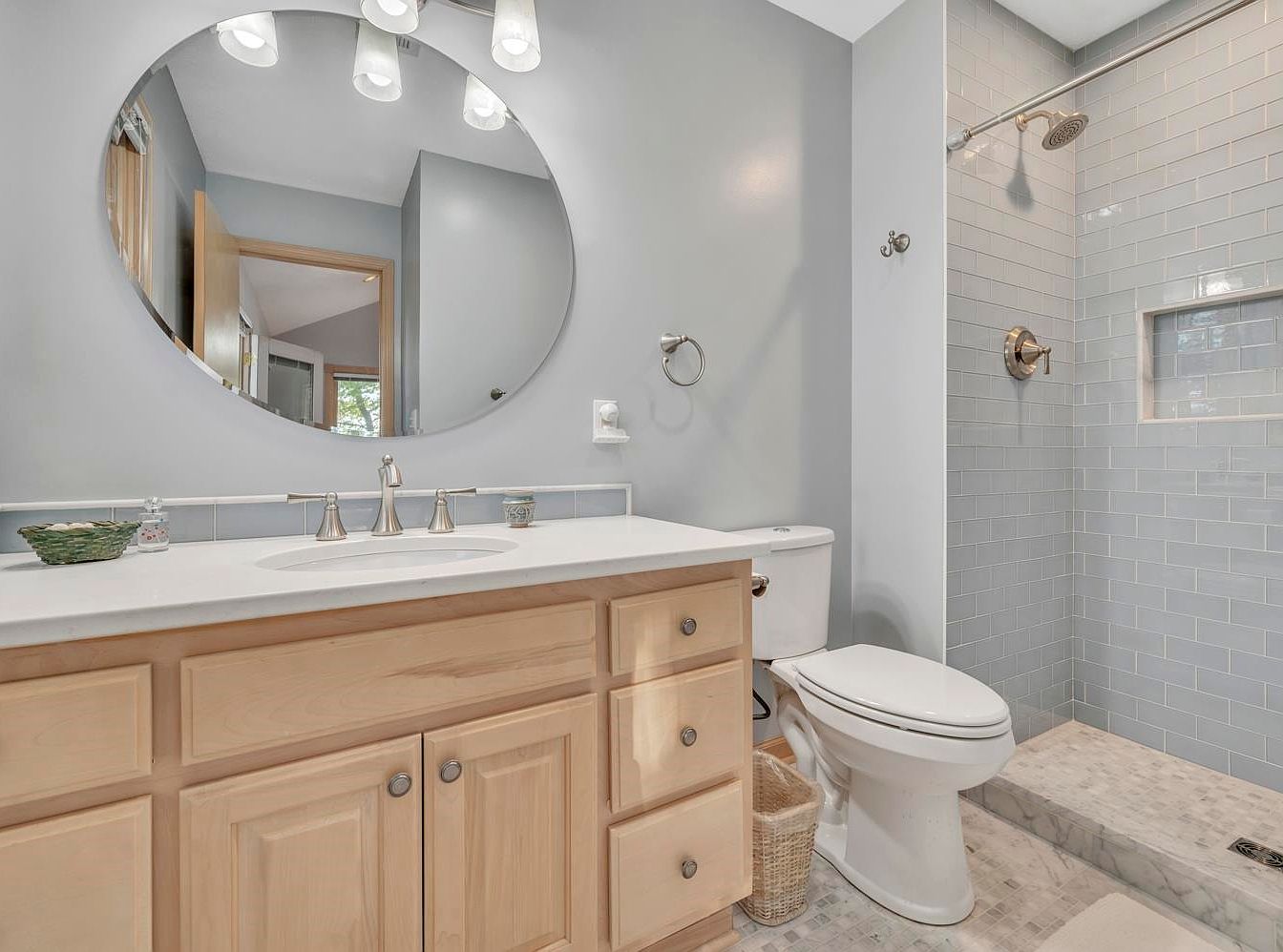 This spacious bathroom harmoniously blends functionality with modern aesthetics. The soft gray walls provide a neutral backdrop for the natural wood cabinetry, creating a warm and inviting atmosphere. A sleek circular mirror hangs above the wide, white countertop, reflecting ample light from stylish overhead fixtures. The shower area features inviting gray subway tiles, complemented by a seamless glass enclosure that enhances the feeling of openness. Family-friendly elements include easy-to-clean surfaces and thoughtful storage options, perfect for keeping essentials within reach. Overall, the design emphasizes comfort and tranquility, making it an ideal retreat for personal care.