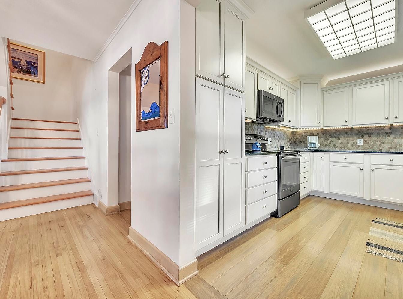 This inviting kitchen corner features a harmonious blend of modern design and functionality. The open layout allows for seamless movement between the cooking space and the adjoining dining area. Crisp white cabinetry paired with sleek black countertops creates a striking contrast, while the elegant mosaic backsplash adds texture and warmth. Ample storage solutions meet practicality, ideal for family gatherings or casual dining. Natural light floods the area, enhanced by the contemporary ceiling fixture. Light hardwood flooring complements the aesthetic, creating a cozy and welcoming ambiance. Decorative touches like the framed art and a playful blue kettle accentuate a homey feel.