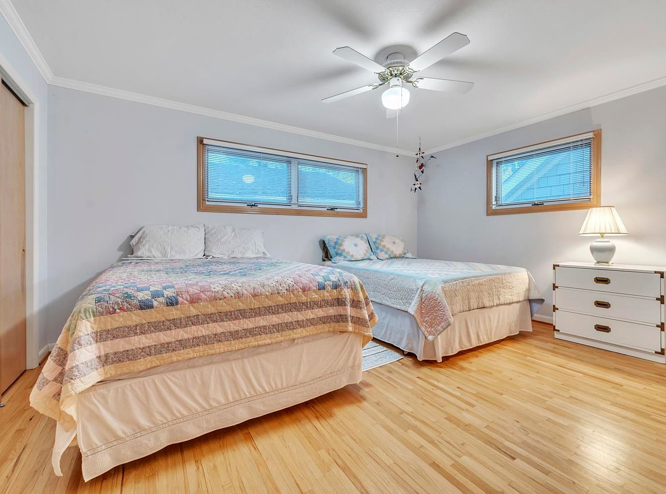 This inviting guest bedroom features two spacious beds adorned with cozy quilts, offering a warm, welcoming atmosphere. Natural light floods in through two strategically placed windows, enhancing the serene gray walls and showcasing the soft textures of the bedding. Hardwood floors add a touch of elegance, while a stylish ceiling fan ensures comfort throughout the seasons. A sleek dresser complements the decor, providing storage while maintaining a clean aesthetic. The arrangement supports family-friendly gatherings, making it perfect for visitors of all ages. Thoughtful details like a bedside lamp and minimal decor enhance its charm, creating a peaceful retreat.