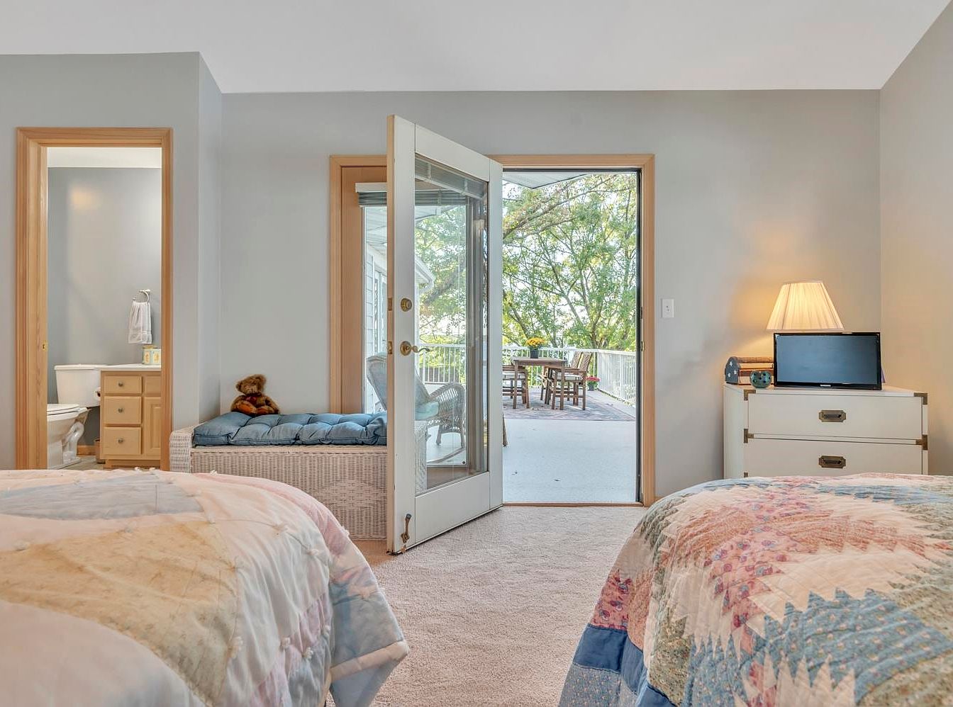 A serene master bedroom invites relaxation with its soft color scheme of light gray walls and plush carpeting. Two cozy beds adorned with colorful patchwork quilts provide a welcoming touch, complemented by a stylish bedside lamp casting a warm glow. Natural light pours in through double doors, leading to an inviting outdoor deck, ideal for morning coffee or evening gatherings. A quaint window seat, complete with cushions, sits alongside a sleek dresser ideal for storage, while a nearby doorway discreetly leads to a private bathroom. This room harmoniously blends comfort and accessibility, creating a perfect family-friendly retreat.