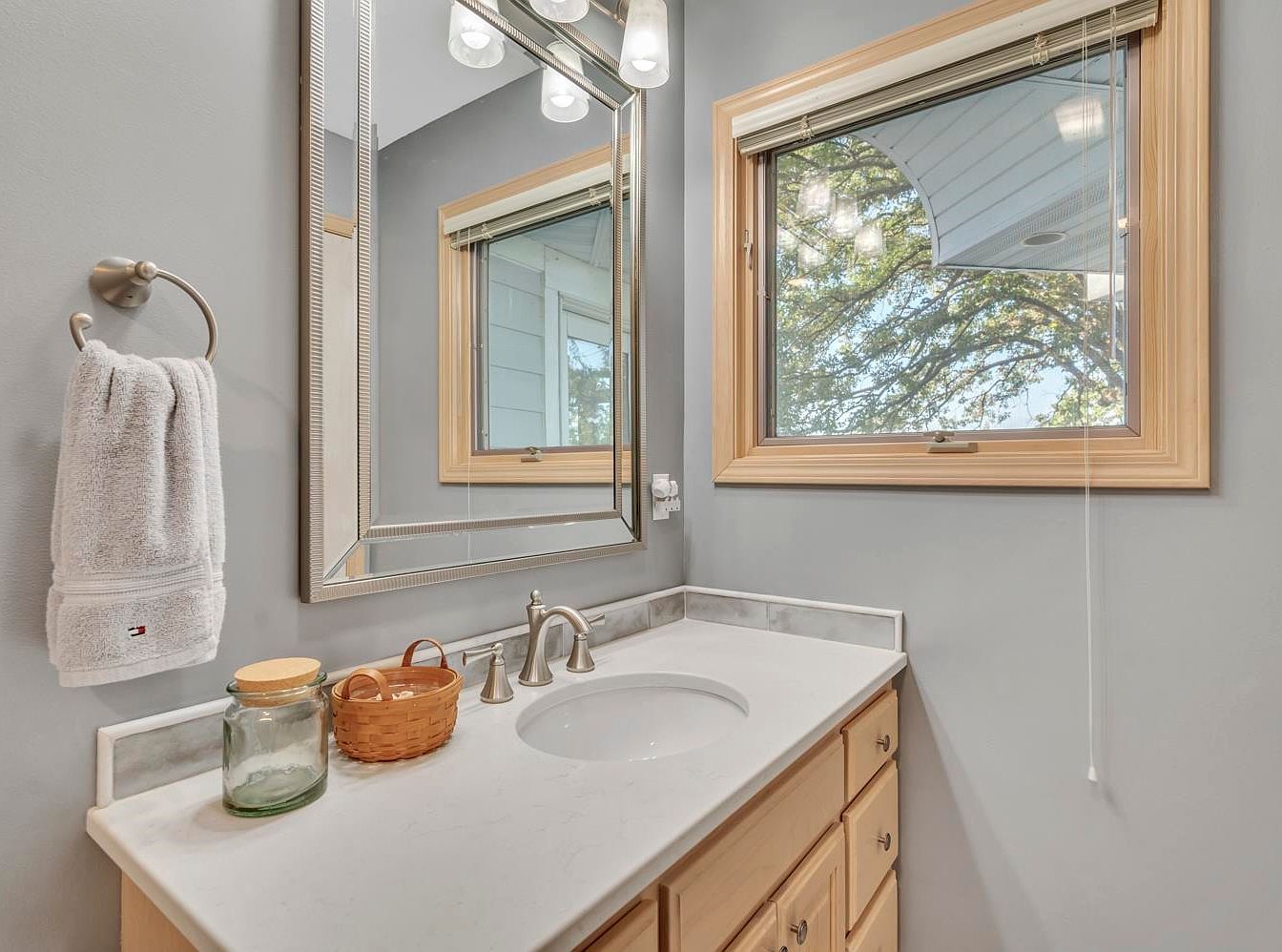 This bathroom blends modern elegance with welcoming simplicity. The soft gray walls provide a serene backdrop, complemented by natural wood accents in the cabinetry and window frame. A spacious countertop, adorned with a sleek white marble finish, offers ample room for essentials. The stylish mirror and well-placed lighting create an inviting atmosphere, perfect for morning routines. A frosted glass window allows natural light to infuse the space while maintaining privacy. Family-friendly features, such as easy-to-reach fixtures and a convenient towel rack, enhance functionality without sacrificing style, making this a harmonious retreat for daily use.