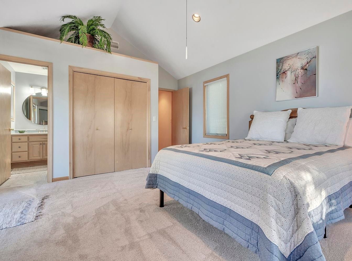 This master bedroom exudes a tranquil and inviting atmosphere. The vaulted ceiling adds a sense of spaciousness, complemented by soft gray walls that enhance the cozy ambiance. A plush bed, adorned with a tasteful quilt, serves as the focal point, flanked by large windows allowing natural light to flood the room. The warm wood accents in doors and furniture contrast beautifully with the carpeted floor, offering a touch of comfort underfoot. A convenient ensuite bathroom is accessible through a stylishly paneled door, while decorative elements, including a potted plant and artwork, introduce warmth and character to the space.