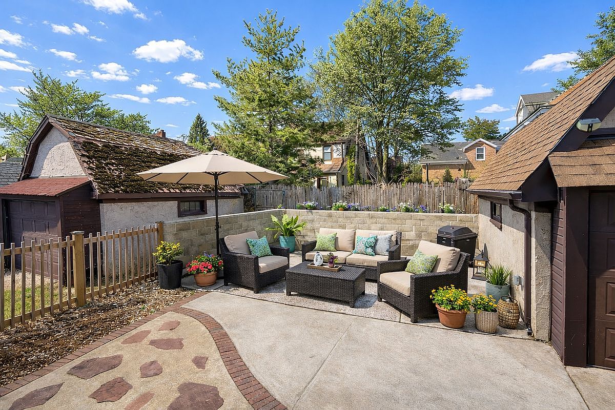 This inviting outdoor patio features a cozy seating arrangement designed for relaxation and social gatherings. The furniture, characterized by dark wicker frames and plush cushions adorned with vibrant, patterned throw pillows, offers a stylish and comfortable atmosphere. A large umbrella provides shade, ensuring family-friendly outdoor enjoyment, while colorful potted plants enhance the aesthetic appeal. The stone pathway, bordered by charming flowers, leads seamlessly to a backdrop of a well-maintained fence and greenery, creating a tranquil escape in the heart of the home. Ideal for barbecues, leisurely afternoons, or simple family moments, this space exudes warmth and hospitality.