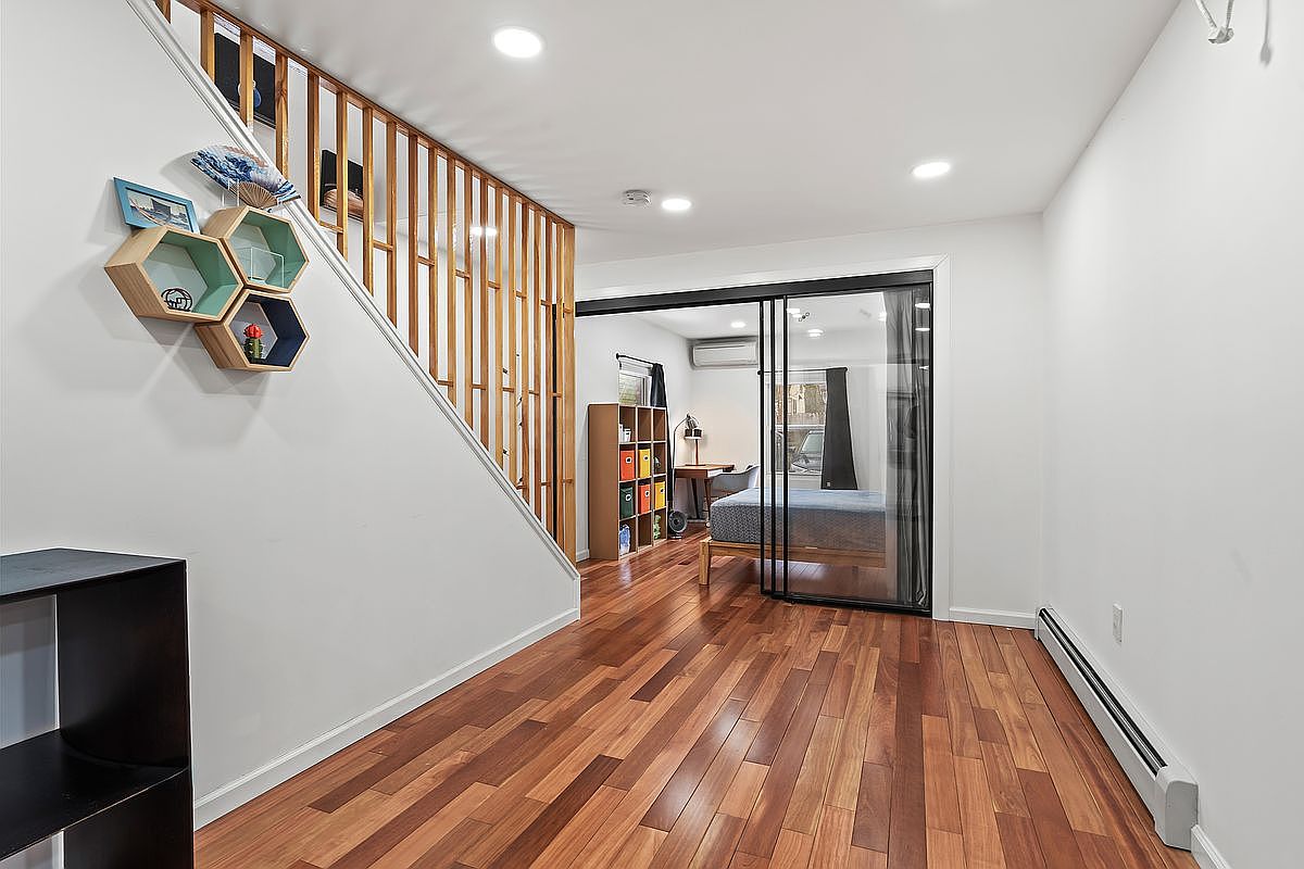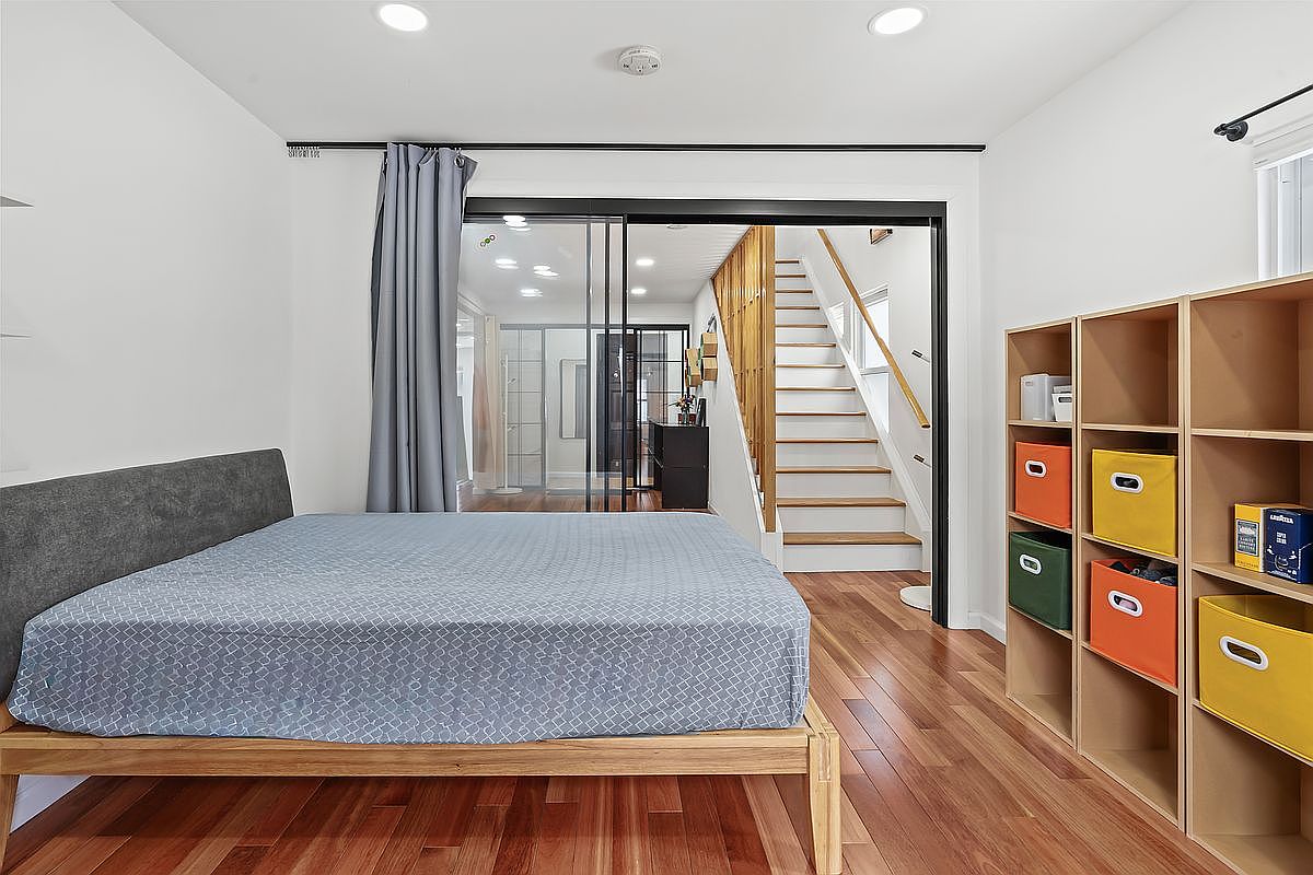This cozy bedroom combines modernity with functionality, boasting a minimalist design that promotes relaxation. The queen-sized bed, featuring a sleek grey upholstered headboard, anchors the space. Light wooden flooring adds warmth, while the soft blue walls enhance the tranquil ambiance. A sliding glass door elegantly separates the room from an inviting staircase that leads to additional living areas, showcasing the home’s open layout. Clever storage solutions with colorful bins keep the space organized, making it perfect for families. Large windows ensure ample natural light, creating a cheerful atmosphere throughout the room.