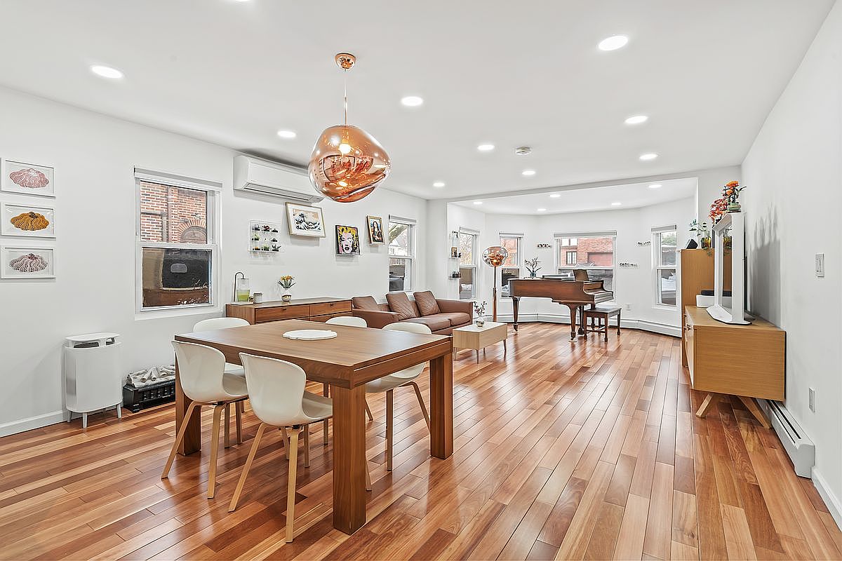 This open living area seamlessly merges comfort and modern aesthetics, showcasing rich, polished hardwood floors that enhance the warm ambiance. A stylish brown leather sectional invites relaxation, creating a cozy gathering spot adjacent to a minimalist coffee table with sleek lines. The dining space features a contemporary wood table surrounded by bright white chairs, evoking a fresh and airy feel. Copper pendant lighting adds a touch of elegance, while strategically placed artwork introduces vibrant colors against the white walls. Thoughtfully designed to be family-friendly, the layout encourages interaction, making it perfect for hosting and daily living.
