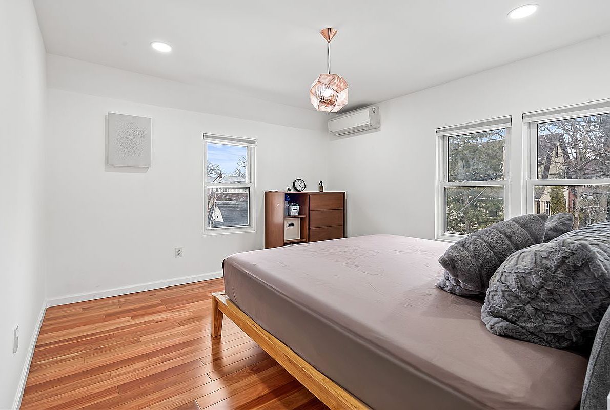 This serene master bedroom boasts a spacious layout, blending comfort with modern aesthetics. The sleek hardwood floors complement the clean, white walls, evoking a sense of calm. Natural light floods in through dual windows, creating an inviting atmosphere. A minimalist wooden bed frame, adorned with plush pillows, becomes the focal point, while a stylish geometric pendant light adds a touch of contemporary flair. The room features a sleek dresser, offering both functionality and style, while the neutral color palette enhances its tranquil vibe. Ideally designed for relaxation, this space is perfect for unwinding after a long day.