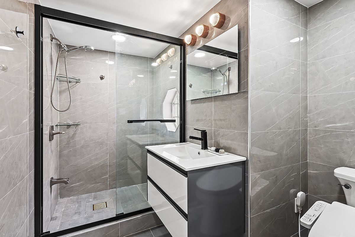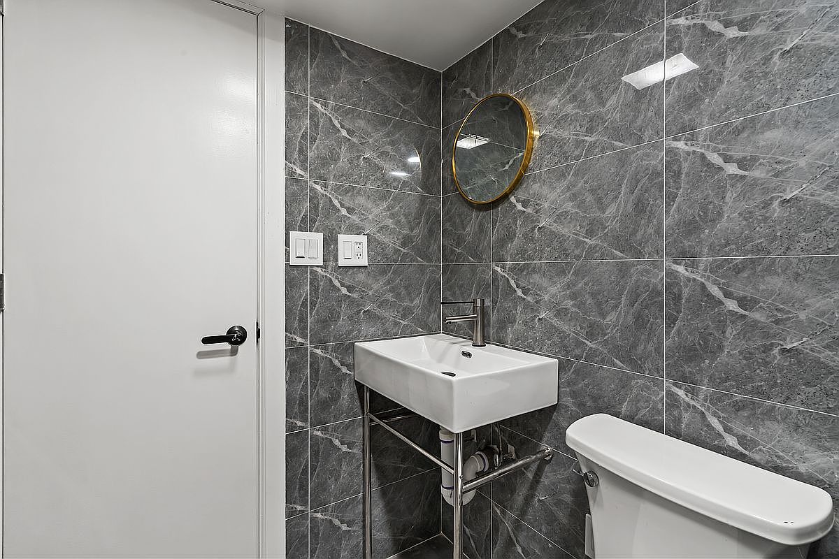 Featuring a sleek, contemporary bathroom layout, this space boasts stunning gray marble tile that enhances its elegance. The white rectangular sink, supported by a minimalist metal frame, complements the brushed stainless steel faucet, adding a chic touch. A round gold-framed mirror reflects light, accentuating the room’s brightness. Subtle yet effective LED lighting illuminates the area, creating a warm atmosphere. The bathroom also includes practical elements like easy-to-reach wall switches and a compact commode, making it family-friendly. The neutral palette is both modern and calming, offering a perfect retreat in any home.