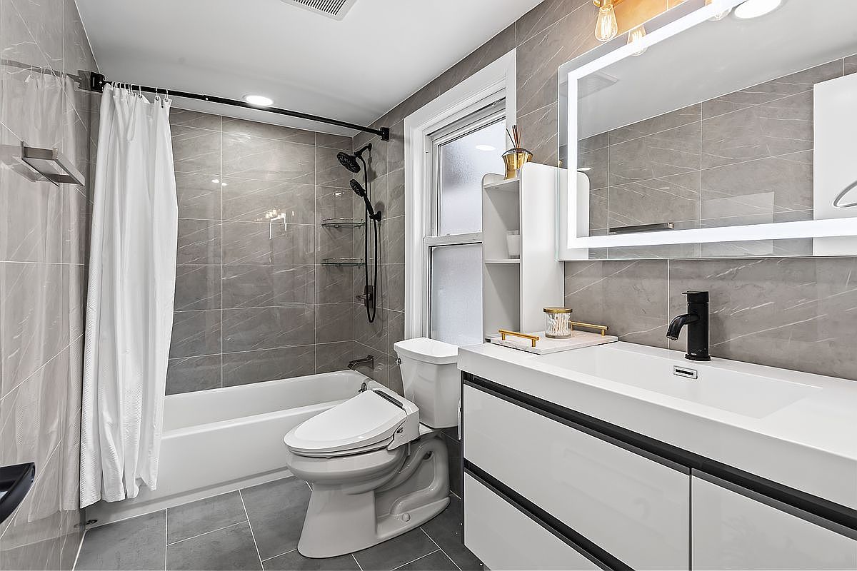 This modern bathroom features a sleek and functional layout, blending comfort with contemporary aesthetics. The large gray tiles create a cohesive look, enhancing the sense of space while the delicate white shower curtain adds softness. A dual-flush toilet and a spacious bathtub ensure practicality for families. The floating vanity, with crisp white cabinetry and black hardware, is strikingly paired with a backlit mirror, adding a touch of sophistication. Ample storage to the side allows for easy organization. Well-placed lighting infuses warmth, making this bathroom a serene oasis perfect for daily routines and relaxation.