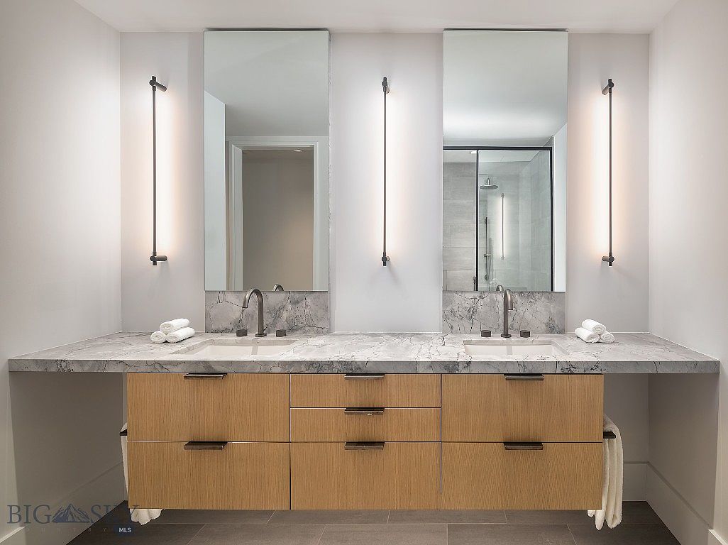 This modern bathroom showcases a spacious dual-sink vanity featuring a luxurious gray marble countertop paired with understated oak cabinetry. The clean lines and minimalist design are complemented by sleek, modern fixtures in a matte black finish. Large mirrors with integrated lighting create an illusion of space and enhance the area’s brightness. Soft white towels are neatly arranged, adding a touch of warmth and convenience, while the stylish light fixtures flanking the mirrors provide functional illumination. A glass-enclosed shower in the background completes this inviting and functional bathroom, ideal for a stylish yet family-friendly environment.
