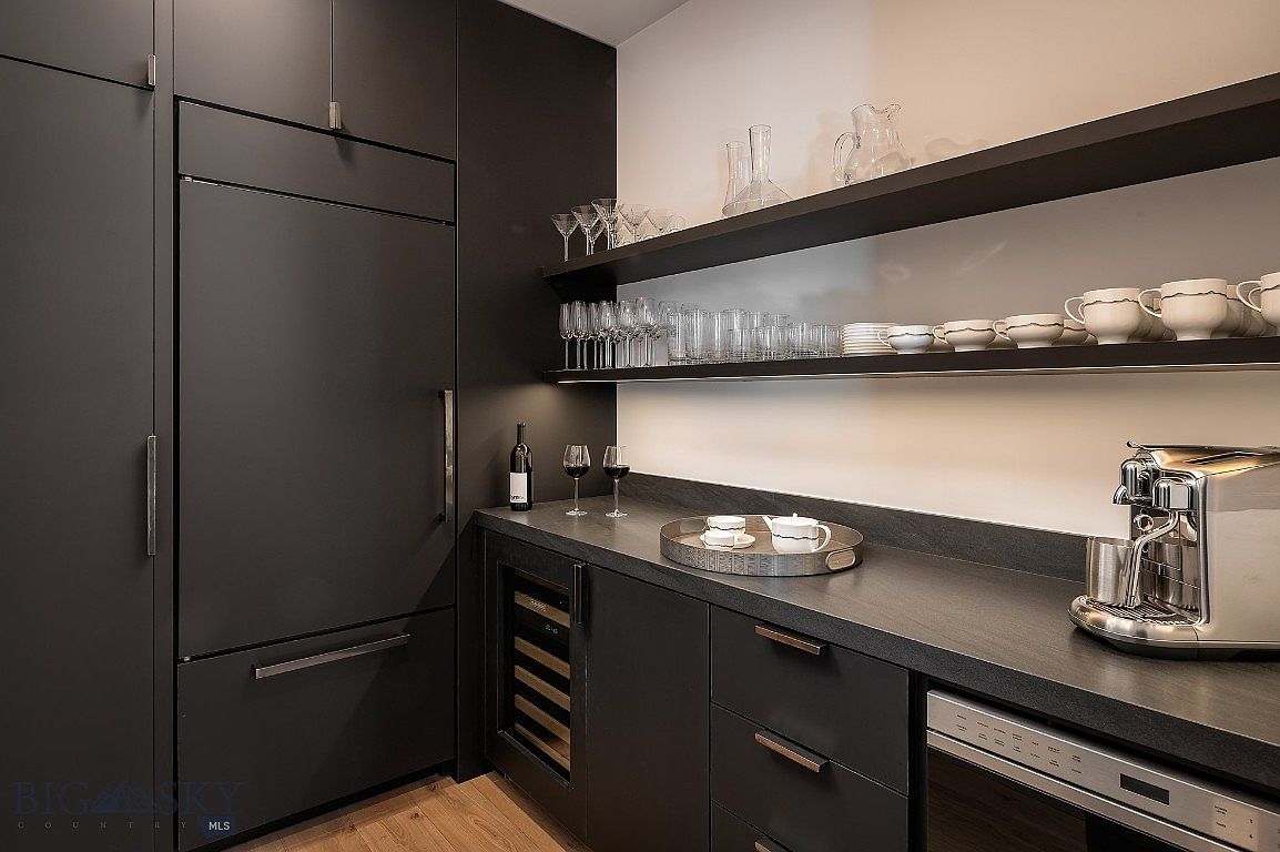 This sleek kitchen corner showcases a sophisticated blend of modern design and practicality. The matte black cabinetry offers a chic, minimalist aesthetic, harmoniously paired with a dark, textured countertop. Open shelving displays glassware and white dish sets, adding a touch of elegance. A wine cooler is subtly integrated into the cabinetry, perfect for entertaining. The culinary space features a high-end coffee machine, ideal for morning rituals. Warm wood flooring complements the dark elements, creating a welcoming ambiance. With streamlined storage solutions and an uncluttered layout, this kitchen corner is both functional and visually stunning, making it perfect for family gatherings.