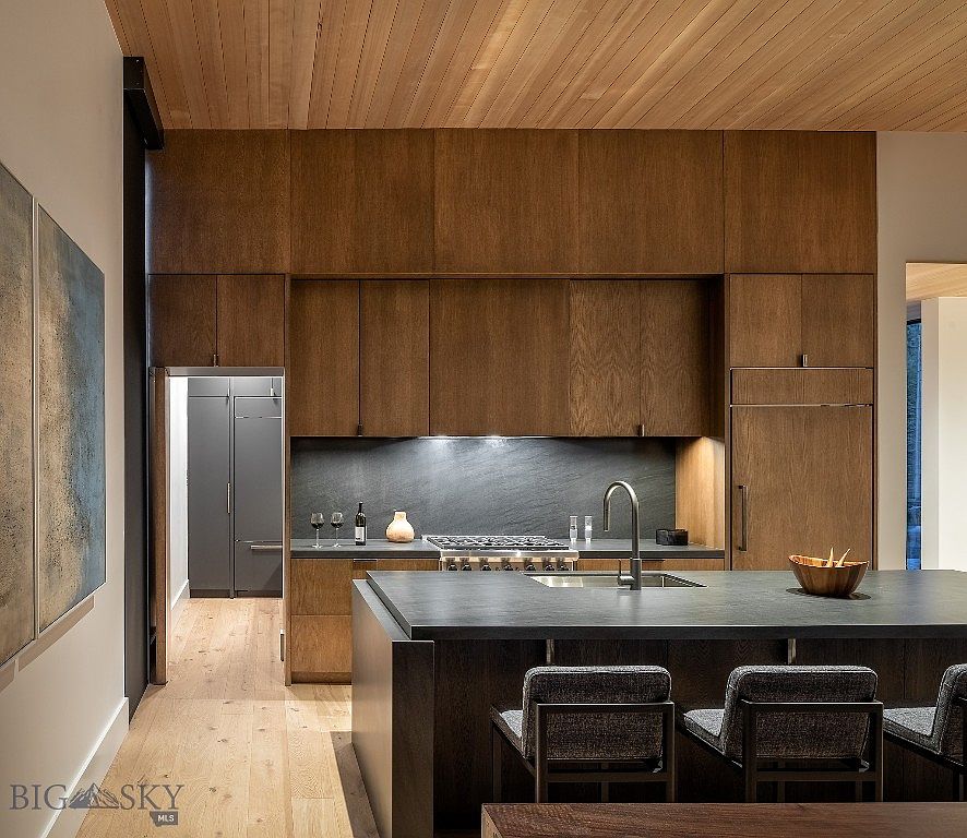 This contemporary kitchen showcases a seamless blend of functionality and aesthetic appeal. Rich wooden cabinetry competes with sleek stone countertops, creating depth and warmth. An elegant island serves as both a workspace and a gathering spot, framed by comfortable, upholstered stools. Under-cabinet lighting highlights the smooth slate backsplash, enhancing the kitchen’s modern elegance while ensuring ample task lighting. The spacious layout encourages family interaction, ideal for casual dining or entertaining. Large appliances integrate smoothly into the cabinetry, maintaining a clean, uncluttered look. Natural wood accents in the ceiling provide a cozy contrast to the modern finishes, embracing a welcoming atmosphere.